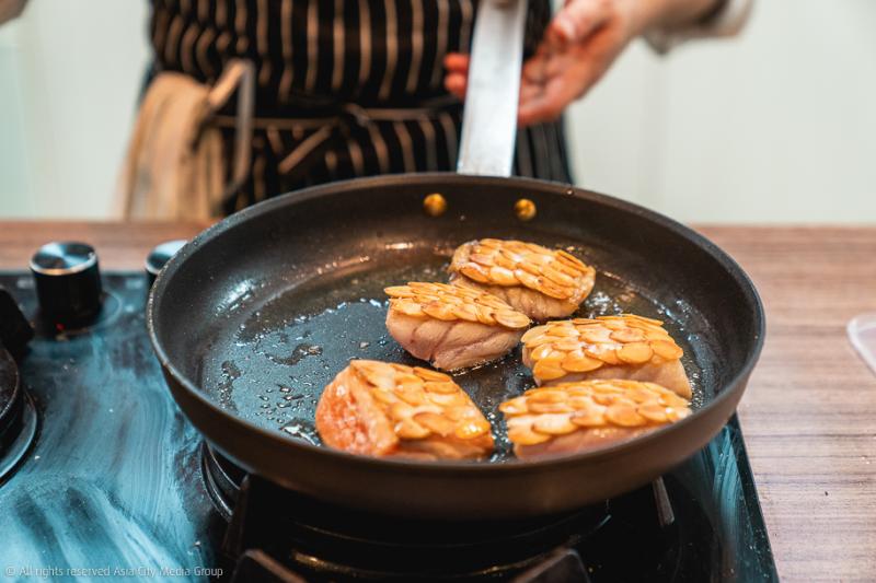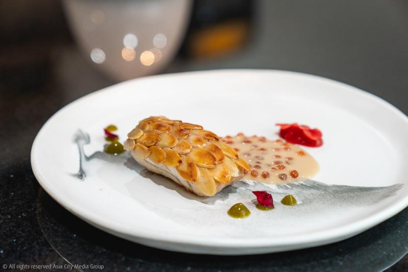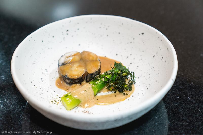 เมนูต่อมาถือเป็นจานที่เรารักมากที่สุดจาก 9 จานของคอร์สนี้ เริ่มจากความละเอียดบรรจงของเชฟด้วยการใช้เทคนิค Almond Scale สร้างเกล็ดกรุบกรอบให้เนื้อปลาเก๋าชิ้นโต ซึ่งผ่านการรีดคาวปลาด้วยเทคนิคแบบฉบับญี่ปุ่นดั้งเดิม เพื่อให้เนื้อปลามีความสดและรสหวาน กินคู่กับซอสเจลกลิ่นคึ่นช่ายและเจลบ๊วยดองใบชิโสะ คือเป็นอะไรที่เวิร์กมาก ให้ตายเถอะ!