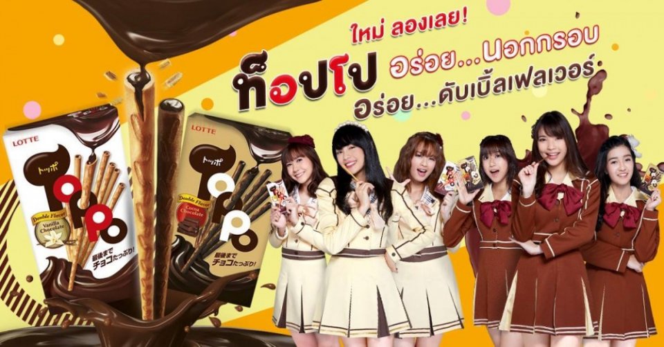 จากเพลงฮิต คุกกี้เสี่ยงทาย พวกเธอเข้าร่วมเป็นพรีเซนเตอร์ให้กับขนมแท่งสอดไส้ช็อกโกแลตยี่ห้อ Lotte Toppo ซึ่งบริษัท Lotte เองก็ติด 1 ใน 5 บริษัทใหญ่ในเกาหลี มีหลายสาขาทั่วโลกร่วมถึงในไทยด้วย แม้ก่อนหน้า Lotte มักจะเลือกหยิบกระแส Korean Wave จากศิลปินจากเกาหลีมาเป็นพรีเซนเตอร์ก็ตาม แต่ขนมแท่งไส้ช็อกโกแลตนี้ได้เปลี่ยนมาเลือกใช้กระแสแบบ Cool Japan และเลือกพลังของ BNK 48 มาช่วยกระตุ้นยอดขาย ทั้งกรอบ ทั้งเข้มข้น และน่ารักขนาดนี้ไม่ชิมไหวเหรอ