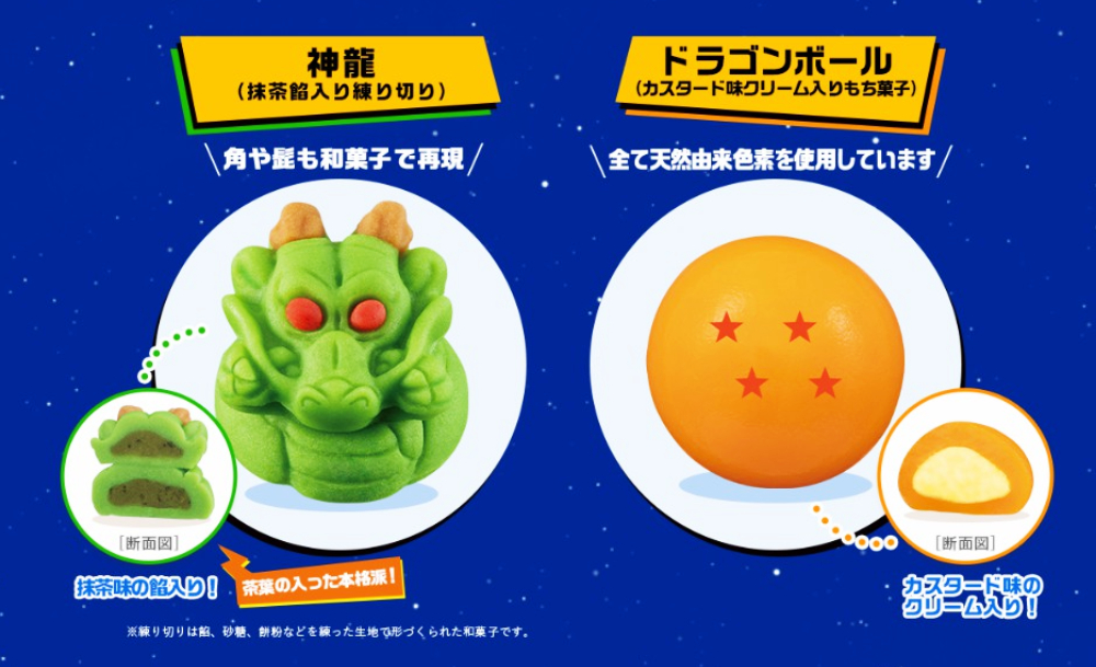 สำหรับเจ้าก้อนแป้งรูปเทพเจ้ามังกรนั้น ด้านในจะสอดไส้ชาเขียว ส่วนเจ้าลูกแก้ว ที่จะมี 7 ลูกตามในเรื่อง (และจะเพิ่มลูกแก้วลับมาอีก 2 แบบ) เป็นไส้คัสตาร์ด ซึ่งแต่ละเซตที่ขายจะมาคู่กันอย่างละ 1 ก้อน แบบแรนด้อมลูกแก้ว เท่ากับว่าเซตขนมหวาน 2 ชิ้น จะมีให้ผู้ซื้อลิ้มลองทั้งสองไส้ ในราคา 398 เยน หรือราว 120 บาท