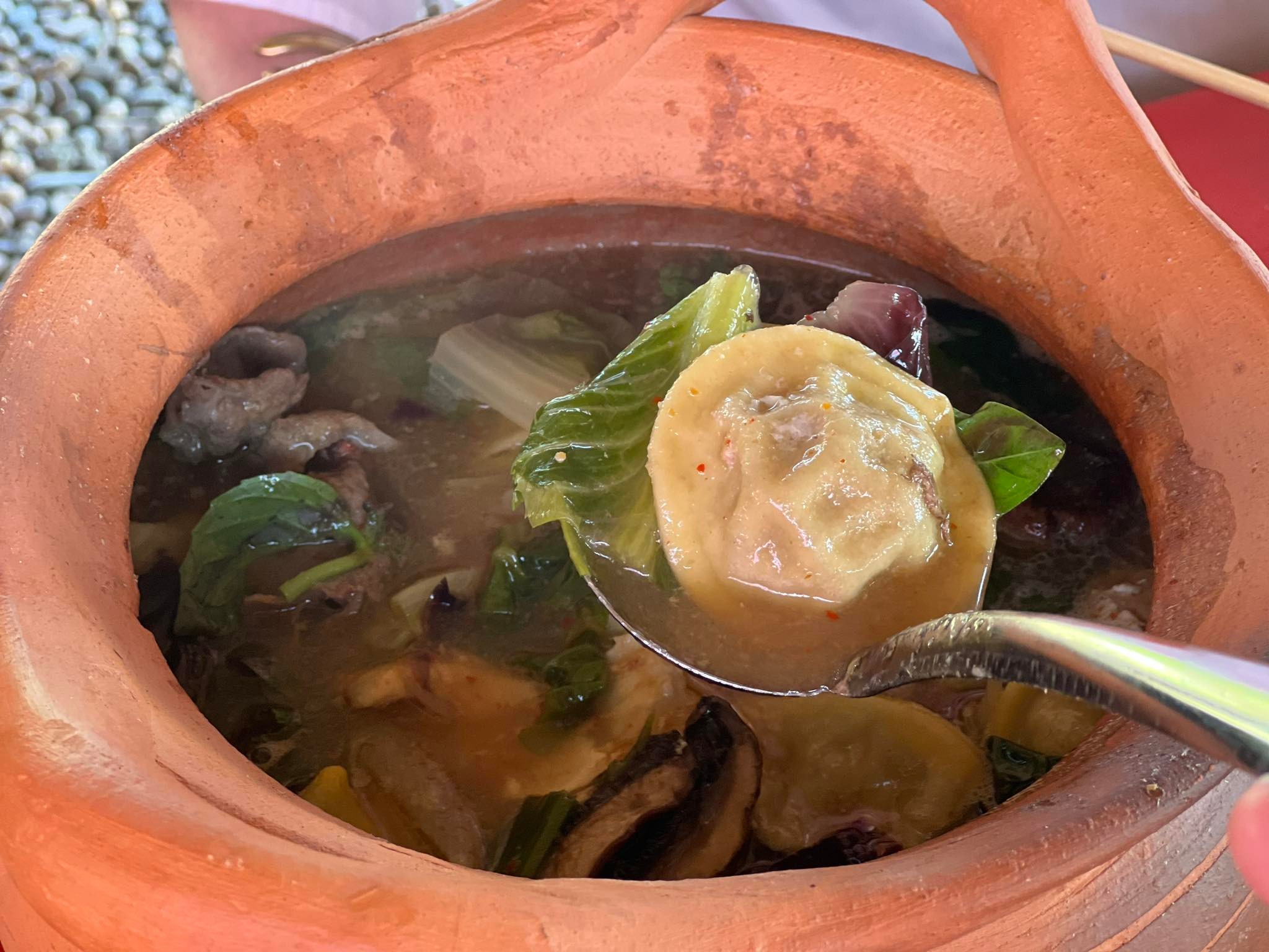 ไฮไลต์ของคอร์สนี้ต้องยกให้เมนูแจ่วฮ้อนที่เชฟเปาโลเรียกว่าเป็น Isaan Hotpot โดยแอบใส่ราวิโอลีทำมือลงไปในหม้อแจ่วฮ้อน ร่วมกับวัตถุดิบออร์แกนิกต่าง ๆ อย่างกุ้งลายเสือจากชาวประมงพื้นบ้านทางภาคใต้ ปลาเก๋าเนื้อแน่นที่ได้จากอวนดักปลาชาวบ้าน และเนื้อวากิวน่องลายจากฟาร์มทางภาคอีสาน กินคู่กับน้ำจิ้มที่มีให้เลือกตั้งแต่รสเปรี้ยว หวาน และขม ซึ่งจุด ๆ นี้เพื่อนต่างชาติโต๊ะข้าง ๆ ถึงกับยกหม้อซด!