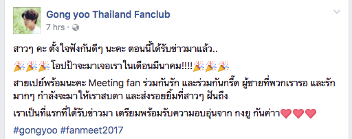 ช่วงห้าโมงเย็นเมื่อวานนี้เพจ Gong Yoo Fan Club Thailand ได้ประกาศข่าวดีเป็นที่แรกว่า กงยู นักแสดงชื่อดังชาวเกาหลีจากซีรี่ส์ Coffee Prince, Goblin และ ภาพยนตร์เรื่อง Train To Busan (รวมทั้ง The Age of Shadows ที่กำลังเข้าฉายอยู่ตอนนี้) จะมาพบปะกับแฟนๆ ในประเทศไทยในช่วงเดือนมีนาคมนี้