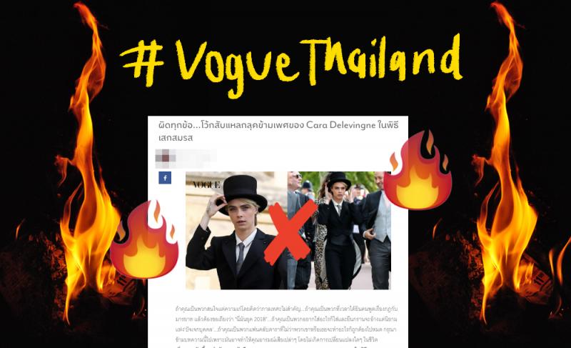 ฝั่งแฟชั่นและสื่อสารมวลชนเองก็มีเรื่องร้อน ๆ มาประดับวงการแฮชแท็กเช่นกัน คราวนี้เป็นทีของสื่ใหญ่อย่าง Vogue Thailand ที่วิจารณ์การแต่งตัวของนางแบบสาว Cara Delevingne ในพระราชพิธีเสกสมรสของราชวงศ์อังกฤษ ที่ใส่สูทผู้ชายมาออกงานแบบหล่อเนี้ยบ แต่กลับถูกผู้เขียนของทาง Vogue Thailand สาบส่งอย่างไม่มีชิ้นดี เริ่มตั้งแต่ชื่อเฮดไลน์ของนิตยสารนี้ที่ว่า "ผิดทุกข้อ...โว้กสับแหลกลุคข้ามเพศของ Cara Delevingne ในพิธีเสกสมรส" แถมพอนักเขียนคนนั้นขึ้นสเตตัสในเฟซบุ๊ก ก็เผ็ดร้อนไม่ต่างกัน ทำให้มีคนทั้งแชร์และคอมเมนต์กันอย่างดุเดือดเลยทีเดียว ซึ่งส่วนตัวของเราคิดว่าเรื่องสไตล์การแต่งตัวก็คงเป็นส่วนหนึ่งของประเด็นนี้ แต่ประเด็นเรื่องที่ไม่ได้แค่วิจารณ์การแต่งกายยอย่างเดียว แต่ยังลามไปถึงเรื่องเพศ เรื่องลุคข้ามเพศของนางแบบสาวนี่แหละที่ทำให้หลายคนรับไม่ได้ ตอนนี้แม้กระแสจะเงียบไปแล้ว แต่เราก็ไม่รู้ว่านี่เป็นแค่หนึ่งในการทำงาน หรือเป็นกลยุทธ์การตลาดของเขากัน เพราะเชื่อว่าหลังดรามานี้น่าจะมีคนเข้าไปกดข่าวของโว้กอ่านเพื่มขึ้นเยอะเลย
