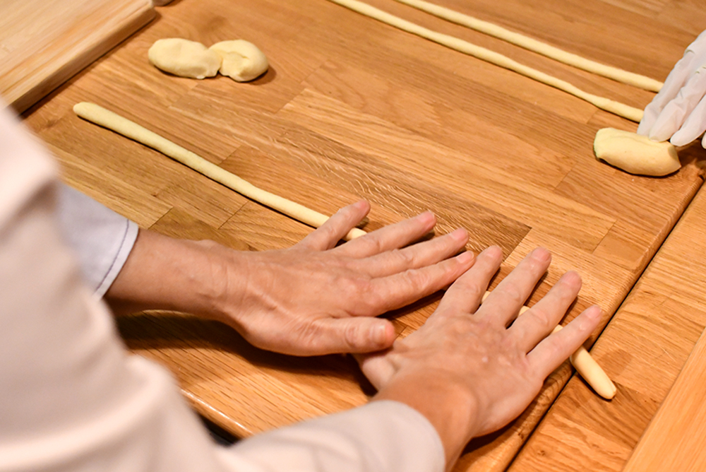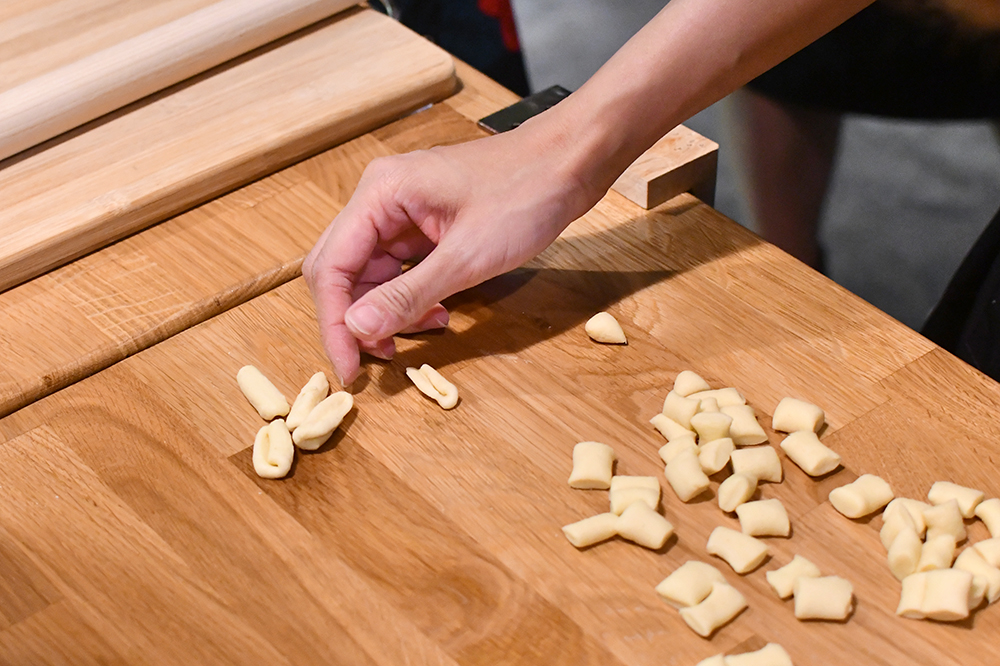 ต่อกันที่จานหลักอย่าง Cavatelli con Salsa Sciue Sciue ที่เชฟชวนเราไปทำพาสต้าที่เรียกว่าเส้นคาวาเทลลิ (Cavatelli) กันตั้งแต่ขั้นตอนการนวดแป้ง ซึ่งเชฟนำแป้งเซโมลาส่งตรงมาจากอิตาลีมาให้ทุกคนลองใช้ ไปจนถึงเคล็ดลับที่ทำให้เส้นพาสต้าชนิดนี้มีรูปทรงคล้ายเปลือกหอยเล็ก ๆ รวมถึงพาผู้เข้าร่วมคลาสทุกคนเดินเข้าครัวไปทำซอสมะเขือเทศที่เรียกว่า 'ซอสชูเอ-ชูเอ' กันแบบตัวต่อตัว