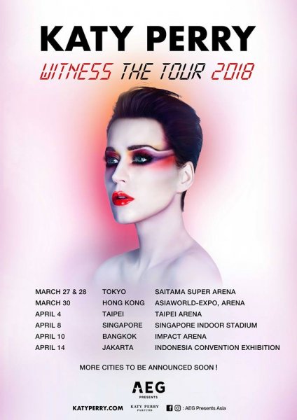 นอกจากกรุงเทพ ฯ แล้ว Katy Perry ยังมีโชว์ที่ประเทศอื่น ๆ ในโซนเอเชียอีกด้วยเหมือนกัน อย่างก่อนหน้ามาไทยก็จะไปโชว์ที่สิงคโปร์ก่อน โดยโชว์ที่กรุงเทพ ฯ จะจัดขึ้นในวันที่ 10 เม.ย. 2018 ณ อิมแพค อารีนา เมืองทองธานี (ที่เดิมที่แม่เคยโชว์) ใครที่ตื่นเต้นเหมือนกับเรา ตอนนี้ก็ฟังเพลงจากอัลบั้มใหม่ของแม่ไปก่อนแล้วกัน