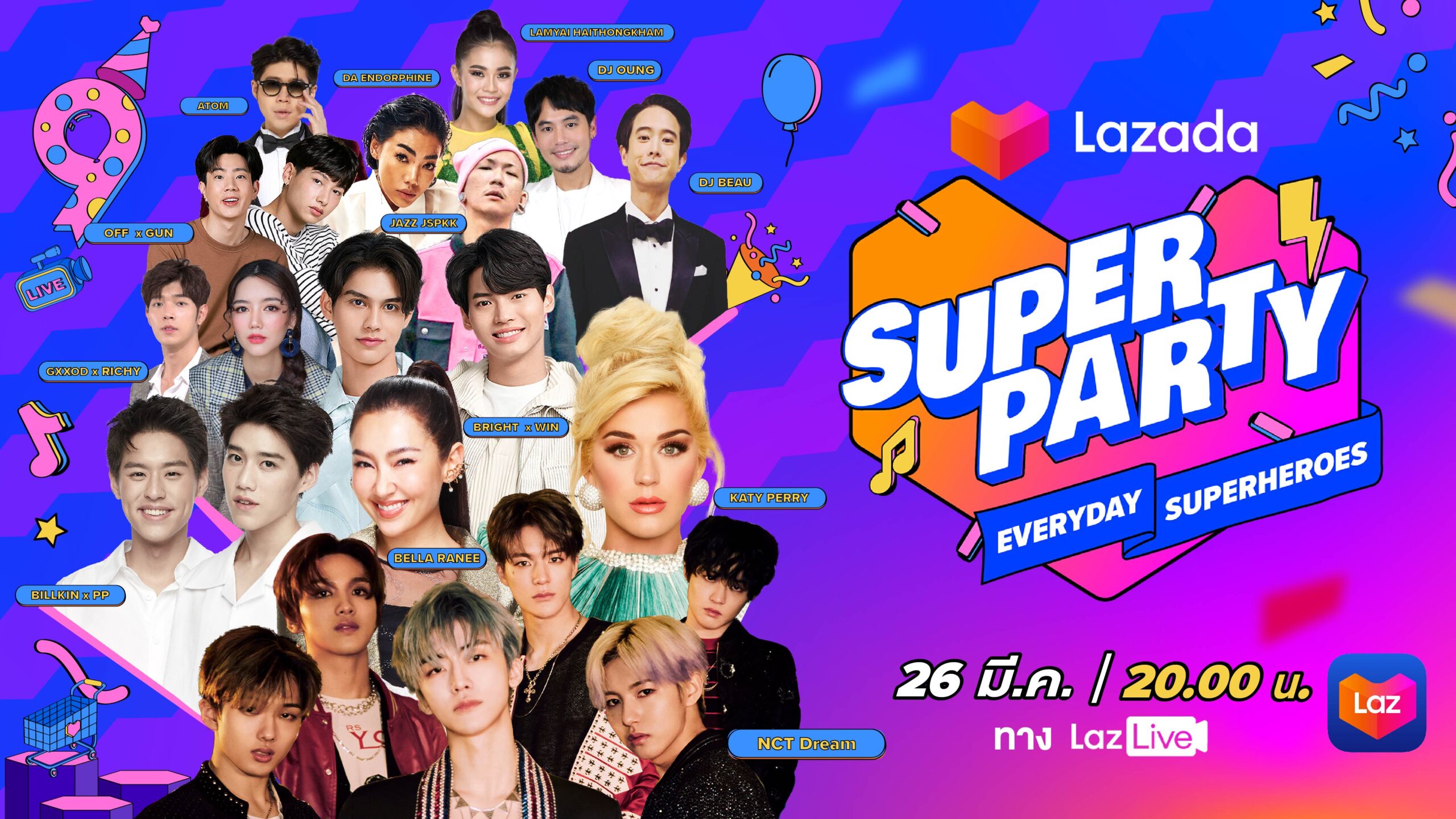 นอกจากนี้ยังมีศิลปินไทยที่มาร่วม Lazada Super Party กันอีกมากมาย อาทิ เบลล่า ราณี, บิวกิ้น-พีพี, ไบรท์-วิน, ก็อต-ริชชี่, ออฟ-กัน, อะตอม ชนกันต์, ดา เอนโดรฟิน และศิลปินท่านอื่น ๆ ที่มากันเยอะจนไม่วอร์มเส้นเสียงคงไม่ได้ เสียงหายไประหว่างทางจะเสียหน้าเอา งานนี้รอเลย ศุกร์ที่ 26 มี.ค.นี้ เวลา 20:00 น. เป็นต้นไป และอย่าลืมอยู่ด้วยกันจนถึงช่วงเวลาเคานต์ดาวน์เข้าสู่วันเกิดปีที่ 9 ของ Lazada ไปกับพวกเขาด้วยนะ กดแจ้งเตือนไลฟ์ คลิก https://s.lazada.co.th/s.djMkw