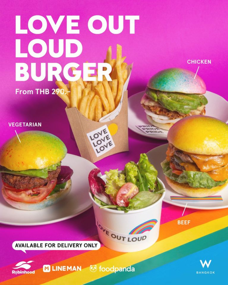 ถึงจะหมดการเฉลิมฉลองเดือนแห่งไพรด์ หรือ Pride Month ไปได้สักพักแล้ว แต่เมนูที่เกิดขึ้นเพื่อการเฉลิมฉลองในเดือนที่ผ่านมา ยังคงมีให้สั่งทางเดลิเวอรี่ให้ฟู้ดดี้ทั้งหลายได้เอ็นจอย อย่างเช่นเมนู Love Out Loud Burger เบอร์เกอร์สีสันสดใสของโรงแรม W Bangkok ที่มีให้เลือกทั้งสำหรับคนกินเนื้อและไม่กินเนื้อ แถมยังมีของหวาน และการจัดเซตในแอปฯ เดลิเวอรี่ให้เราออร์เดอร์ได้คุ้มราคากว่าด้วย