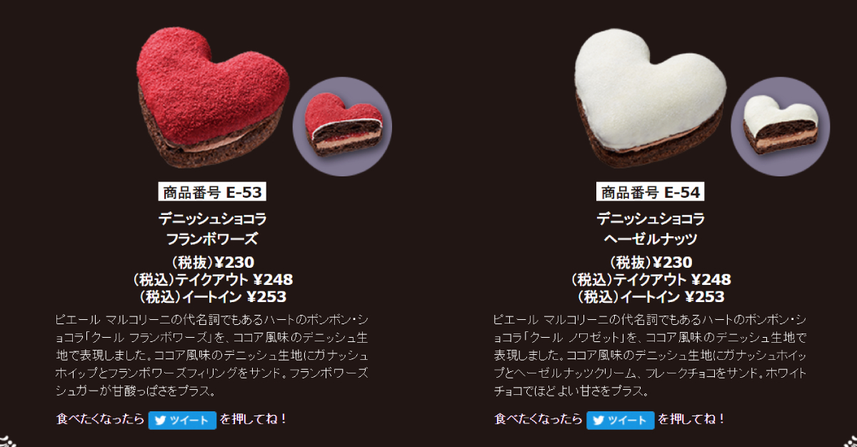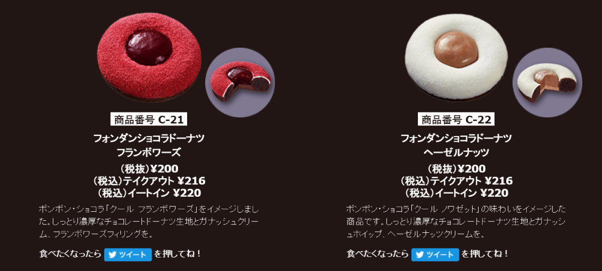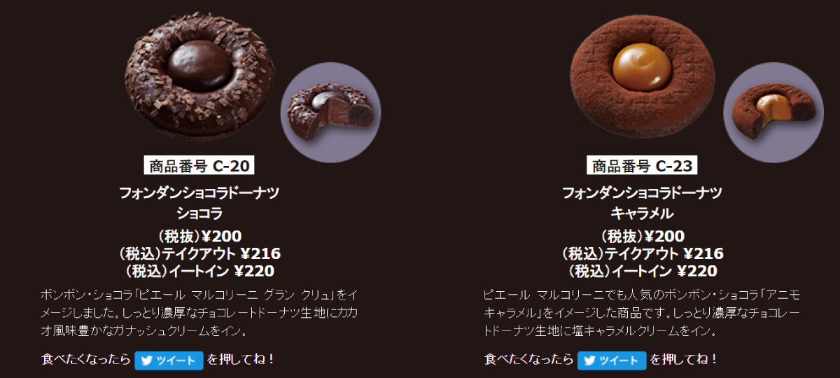 Mister Donut x Pierre Marcolini ประกอบด้วยโดนัท 6 แบบ แบ่งเป็นเชปแบบคุกกี้ มีฟิลลิ่งช็อกโกแลตฟองดองตรงกลาง 4 รส และแบบแซนด์วิชรูปหัวใจ โดดเด่นด้วยความเป็นช็อกโกแลตเบลเยียมแท้ ๆ สุดเข้มข้นอีก 2 แบบ โดยฟิลลิ่ง 4 รสแรกที่ว่าไป ก็มีทั้งช็อกโกแลต คาราเมล ฟรองบัวซ์ (ราสป์เบอร์รี) และเฮเซลนัท ซึ่งโดนัทหัวใจที่บอกว่าเข้มข้น ๆ นี่ก็มีฟิลลิ่งคล้าย ๆ กับโดนัทกลม ตรงที่มีรสช็อกโกแลตเฮเซลนัท และรสฟรองบัวซ์ เป็นตัวชูโรง
