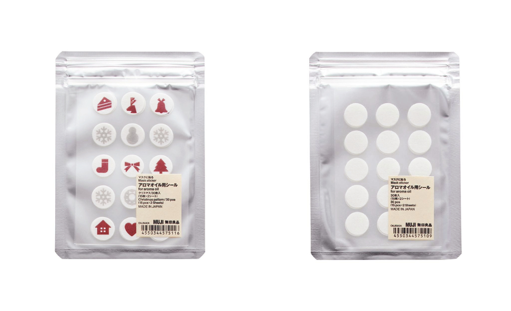 Mask Sticker for Aroma Oil ของ MUJI ไม่ได้มาพร้อมกับอะโรมาออยล์ นั่นคือผู้ใช้สามารถเลือกได้ว่าจะป้ายสติกเกอร์ด้วยออยล์ที่ชื่นชอบและใช้อยู่แล้ว หรือซื้อแยกต่างหากจากแบรนด์ MUJI ซึ่งด้วยบรรยากาศ Festive แบบนี้ เขาก็มีทั้งสติกเกอร์สีขาวเพลน ๆ ให้ติดบนแมสก์แบบเนียน ๆ และทั้งสติกเกอร์ลายคริสต์มาส/ฤดูหนาว ที่ช่วยสร้างกิมมิกให้ชีวิตประจำวันของเราได้แบบคิวต์ ๆ