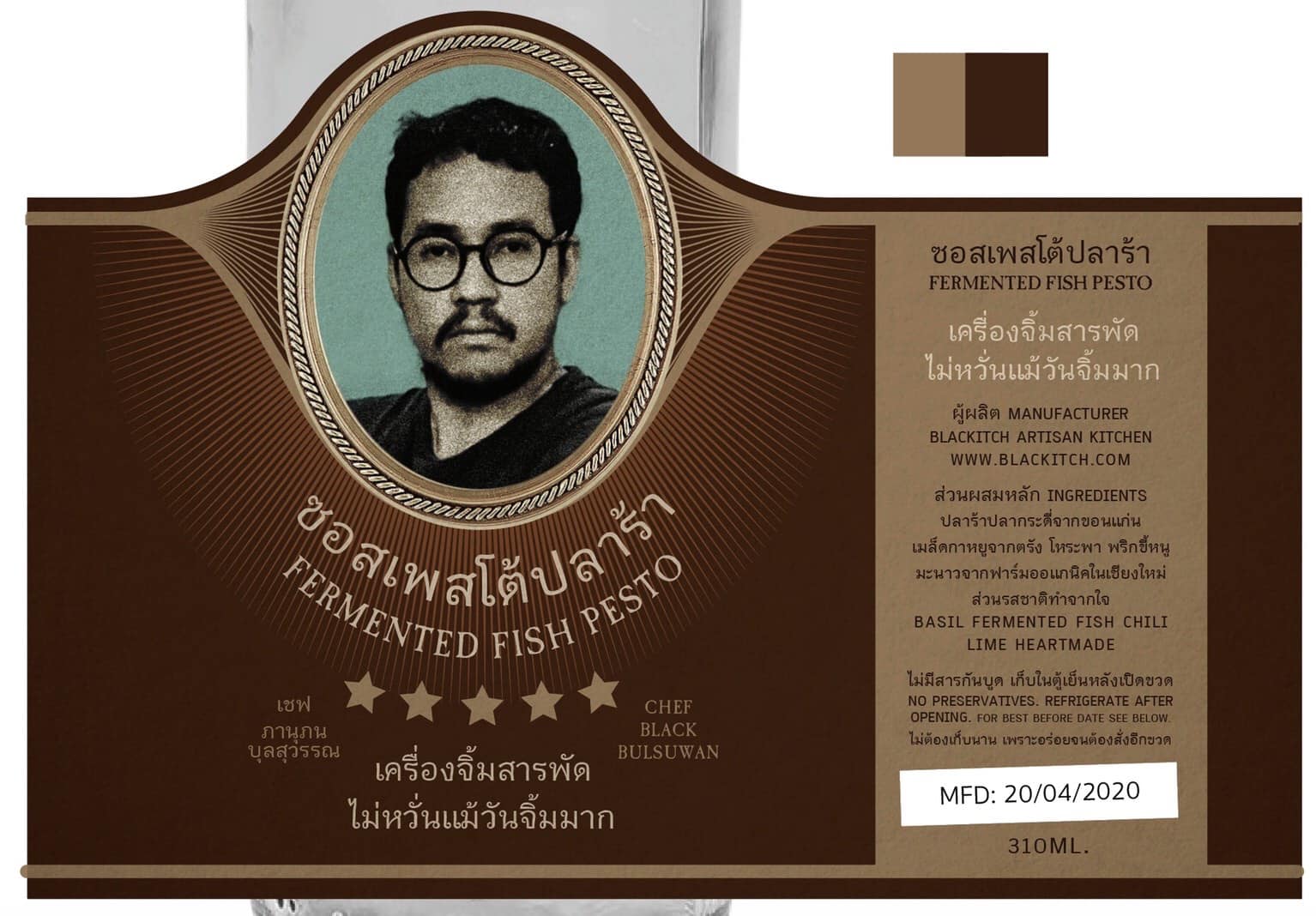 และที่ประทับใจเราสุด ๆ คือหน้าตาฉลากซอสเพสโต้ปลาร้า โดยเชฟแบล็ก-ภานุภน บุลสุวรรณ เจ้าของร้านดัง Blackitch Artisan Kitchen ร้านอาหารสไตล์อาร์ติซาน-พื้นบ้านแห่งเมืองเชียงใหม่ ผู้ผลิตเครื่องจิ้มสารพัดประโยชน์ จิ้มได้กับทุกสิ่งอย่างตามคำโปรย 'เครื่องจิ้มสารพัด ไม่หวั่นแม้วันจิ้มมาก'