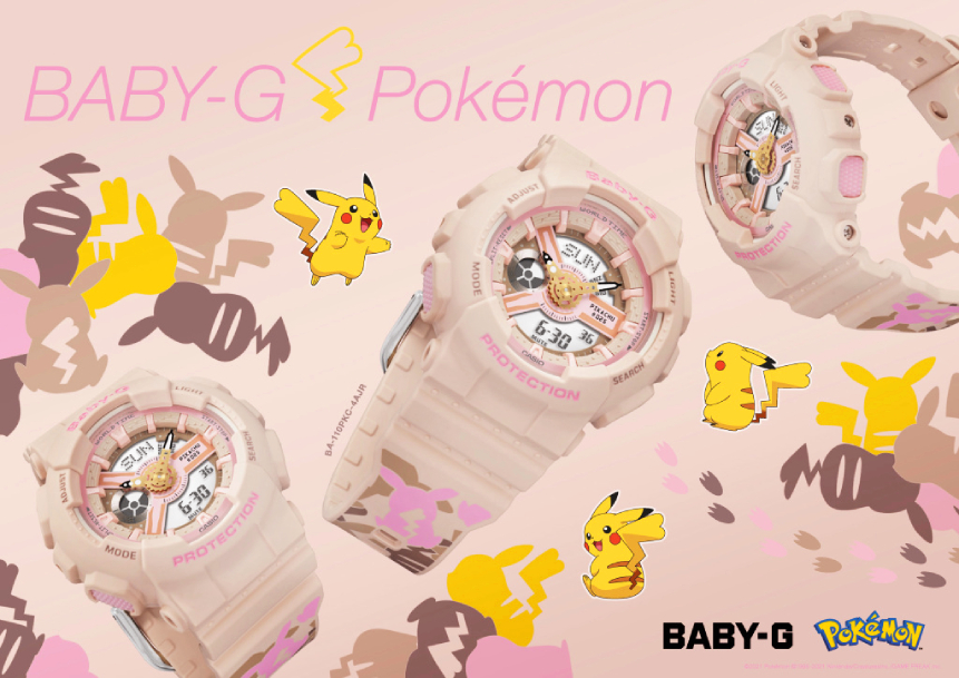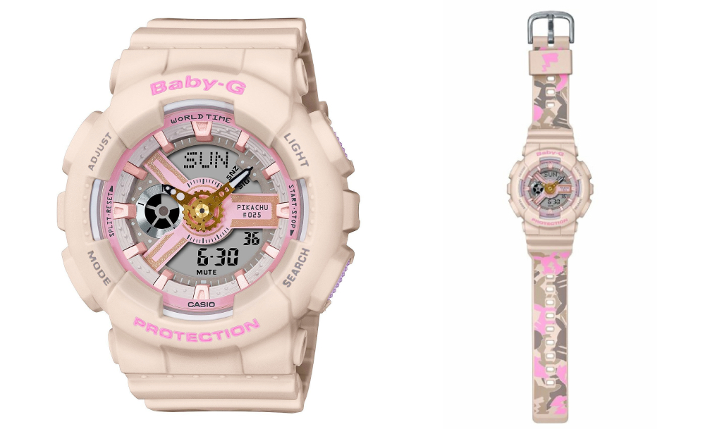 Pikachu x BABY-G รุ่น BA-110PKC มาในดีไซน์สายเรซินลายพรางสีชมพู-เบจ ซึ่งลายพรางของเขาก็มีซิลูเอตเป็นเจ้า Pikachu เนี่ยแหละ หน้าปัดสามารถแสดงเวลาทั้งแบบแอนะล็อกและดิจิทัล โดยที่เข็มนาฬิกายังคล้ายกับหูของน้องไปอีก เท่ากับว่าเมื่อเราดูเวลาตอน 10:10 น. หรือ 13:50 น. แล้ว จะเหมือนเราจ้องหน้าคาแรกเตอร์สุดน่ารักตัวนี้อยู่เลย