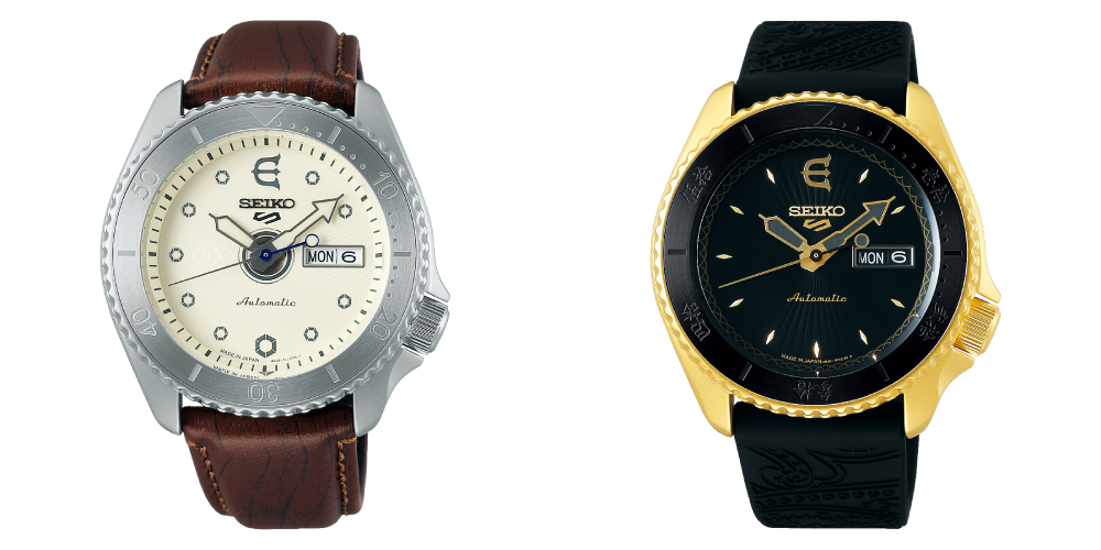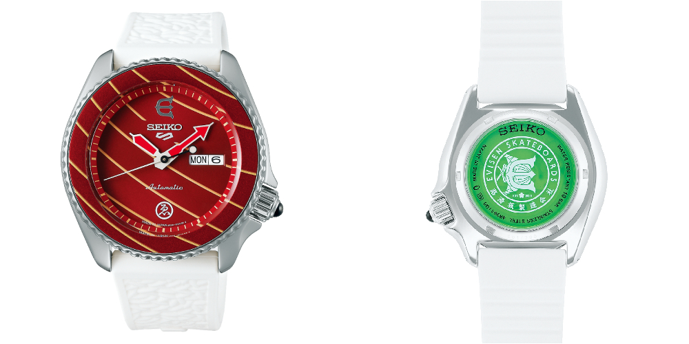 นาฬิกา Seiko x Evisen Skateboards โมเดล Seiko 5 Sports รุ่น SRPF93K, SRPF94K และ SRPF95K มาในสีออฟไลต์ ดำ/ทอง และ 'แดงซาชิมิ' โดย SRPF93K เน้นดีไซน์ที่สะท้อนถึงวัสดุที่นำมาทำสเกตบอร์ด พร้อมสายหนังแท้ที่พยายามทำให้เป็นลายไม้ ขณะที่ SRPF94K สีดำเคร่งขรึมมากับโลโก้หมวกซามูไรของแบรนด์และตัวอักษรคันจิ สายเป็นซิลิโคนเนื้อดี