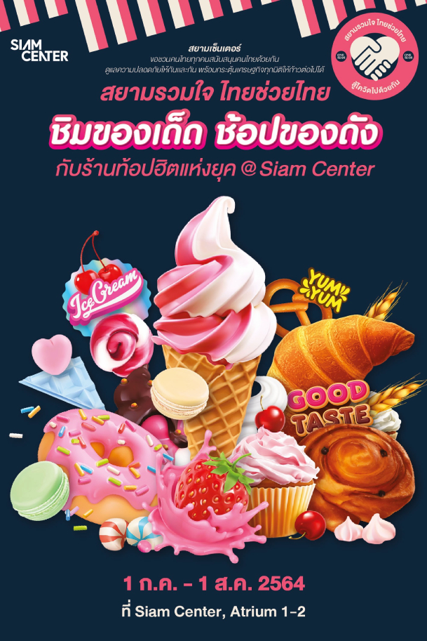เพราะการระบาดของโควิดยังคงมีอยู่อย่างต่อเนื่อง และทางแก้อย่างวัคซีนยังคงเป็นสิ่งที่เข้าถึงได้ยาก ธุรกิจต่าง ๆ ก็ฝืดเคืองตามสภาพสังคมและผู้คนไปด้วย ทาง Siam Center เลยอยากใช้พื้นที่กลางเมืองที่เข้าถึงง่ายของตัวเองให้เป็นประโยชน์กับเจ้าของกิจการอาหารเครื่องดื่ม เลยตัดสินใจเปิดชั้น G ของห้างให้ร้านดังมารวมตัว งานนี้มีทั้งครัวซองระดับมิชลินสตาร์ คุกกี้เนื้อนุ่มไส้เยิ้ม ชูครีม ไอศกรีม ของหวานไร้แป้งไร้น้ำตาลเพื่อสุขภาพ กาแฟสกัดเย็น น้ำชาใบกัญชา ฯลฯ