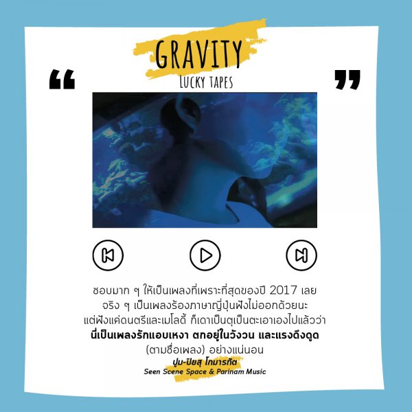 Gravity ของ LUCKY TAPES ชอบมาก ๆ ให้เป็นเพลงที่เพราะที่สุดของปี 2017 เลย จริง ๆ เป็นเพลงร้องภาษาญี่ปุ่นฟังไม่ออกด้วยนะ แต่ฟังแค่ดนตรีและเมโลดี้ ก็เดาเป็นตุเป็นตะเอาเองไปแล้วว่า นี่เป็นเพลงรักแอบเหงา ตกอยู่ในวังวน และแรงดึงดูด (ตามชื่อเพลง) อย่างแน่นอน — ปูม-ปิยสุ โกมารทัต จาก Seen Scene Space และ Parinam Music