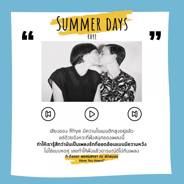Summer Days ของ Rhye เสียงของ Rhye มีความโรแมนติกสูงอยู่แล้ว แต่ด้วยจังหวะที่ฟังสนุกของเพลงนี้ทำให้เรารู้สึกว่ามันเป็นเพลงรักที่ออดอ้อนแบบมีความหวัง ไม่ใช่แบบหดหู่ เลยทำให้ฟังแล้วอารมณ์ดีไปกับเพลง — กิ-กิรตรา พรหมสาขา ณ สกลนคร จาก Have You Heard?