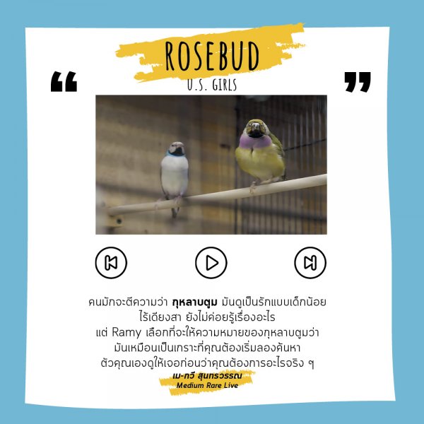 Rosebud ของ U.S. Girls คนมักจะตีความว่า กุหลาบตูม มันดูเป็นรักแบบเด็กน้อย ไร้เดียงสา ยังไม่ค่อยรู้เรื่องอะไร แต่ Ramy เลือกที่จะให้ความหมายของกุหลาบตูมว่า มันเหมือนเป็นเกราะที่คุณต้องเริ่มลองค้นหาตัวคุณเองดูให้เจอก่อนว่าคุณต้องการอะไรจริง ๆ — เม-กวี สุนทรวรรณ จาก Medium Rare Live