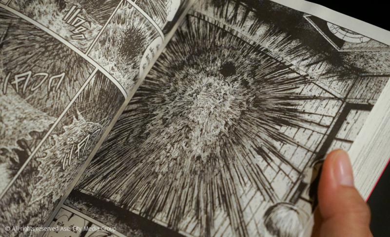 ถ้าคิดว่าเรื่องก่อนหน้าสร้างบรรยากาศได้ขนลุกแล้ว ต้องเจอเรื่องนี้ก่อน เพราะสำหรับเราแล้วขอยกให้เรื่องนี้เป็นเรื่องที่อี๋แหวะที่สุดในซีรีส์คลังสยองเลย กับบรรยากาศของน้ำมันที่อยู่รอบบ้านอย่างเหนียวเหนอะหนะ อาจารย์อิโต้วาดบรรยากาศที่อบอวลไปด้วยน้ำมันลื่น ๆ มัน ๆ ที่ติดอยู่กับตัวละคร และพื้นที่ต่าง ๆ ของบ้านของตัวละครได้จนเรารู้สึกเหมือนได้กลิ่นหืนของน้ำมันออกมาจากภาพเลย (เทพมาก!) เรื่องราวของครอบครัวหนึ่งที่เปิดร้านเนื้อย่างชื่อ ดารุมะ แต่การระบายอากาศของร้านนั้นไม่ได้ ทำให้ไอน้ำมันลอยฟุ้งและสะสมไปทั่วบ้าน ติดเหนอะไปทุกอย่างแม้กระทั่งเสื้อผ้า หรือเครื่องนอน แถมพ่อผู้เป้นเจ้าของบ้านก็มีความมันเยอะมาก ส่วนพี่ชายที่มีอายุมากกว่า 2 ปีก็เป็นคนแปลก เพราะชอบแอบดื่มน้ำมันสลัดเพียว ๆ อยู่บ่อย ๆ จนตัวมีแต่น้ำมัน หน้าผุดไปด้วยสิวเต็มไปหมด ซึ่งเป็นที่มาของฉากสุดสะพรึงในภาพด้านบนนี่แหละ เห็นแล้วขอพักการกินไส้กรอกชีสไปชั่วคราวเลย...