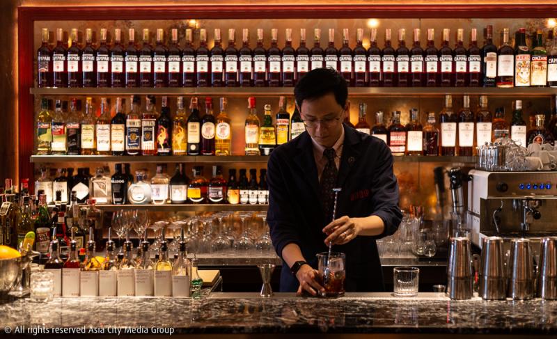 และด้วยความเป็นบาร์อิตาเลียน สิ่งที่เราเห็นอย่างเตะตาเป็นอย่างแรกคือเคาน์เตอร์บาร์ในร้านนี่แหละ แม้ขนาดของบาร์จะเล็กกว่า Vesper แต่ร้านกลับใช้ลูกเล่นของเส้นสายและส่วนเว้าโค้งที่ให้หน้าบาร์เลื้อยมาตั้งแต่กำแพงหน้าร้าน จึงให้ดูกว้างขึ้น หน้าร้านเลือกใช้สีน้ำเงินดูเคร่งขรึม แต่ภายในร้านกลับใช้โทนสีขาว-เขียว-ดำ เป็นหลัก คุณปาล์มบอกว่าโทนสีนี้เป็นที่นนิยมในฟลอเรนซ์ และเป็นภาพแทนของความเป็นอิตาลีได้ดี