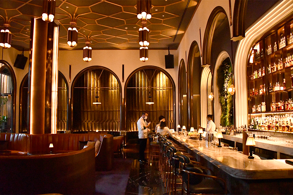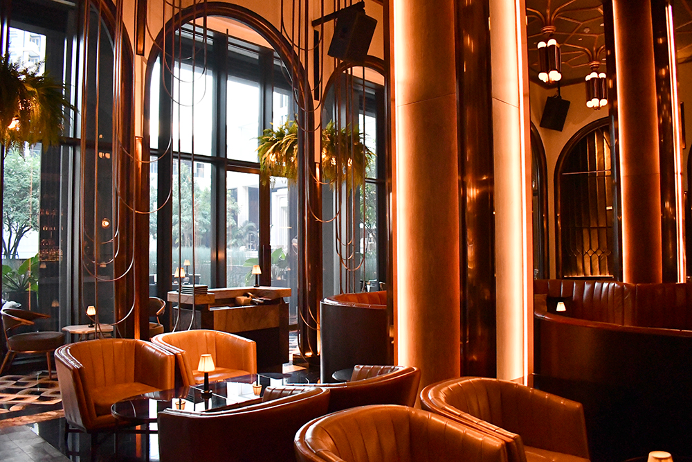 เราชอบตัวโครงสร้างของอาคารที่แยกออกมาชัดเจนจากตัวโรงแรม Four Seasons ทางเข้าด้านหน้าถูกออกแบบมาให้สามารถทอดสายตามองวิวแม่น้ำเจ้าพระยาในยามเย็นได้ แต่ทั้งนี้ทั้งนั้น เราก็ไม่อยากให้ทุกคนอ้อยอิ่งอยู่หน้าประตูนาน เพราะความสนุกจริง ๆ รอคอยอยู่ที่ด้านใน ซึ่งเมื่อเปิดประตูเข้าไปจะรู้สึกเหมือนหลุดเข้าไปอยู่ในอีกโลกแทบจะทันที สถาปัตยกรรมแบบ Art Nuvo ถูกจับมาใช้เป็นต้นแบบของเหล็กดัดทรงโค้งสีทองด้านบนเพดาน โดดเด่นด้วยประกายสีบรอนซ์ทอง ซึ่งเป็นโทนสีหลักของร้าน และมีไฮไลต์เป็นเคาน์เตอร์บาร์ยาวขนาดยักษ์ ทอดตัวประจันหน้าแขกผู้มาเยือนอยู่ที่ฝั่งปลายสุดห้องโถง ขนาบข้างด้วยที่นั่งโซฟาหนังทรงโค้งที่ให้ความรู้สึกเป็นส่วนตัว แต่สำหรับใครที่ชอบการโซเชียล เราแนะนำให้เลือกนั่งที่โซฟาทรงตัว S ณ กึ่งกลางร้าน เรียกได้ว่าแค่เห็นการตกแต่งภายในก็ขนลุกซู่แล้วแม่!