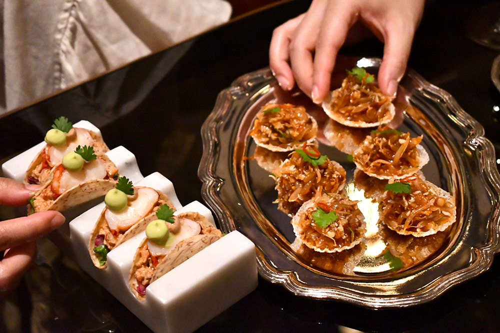 สำหรับสายตี้ที่มาเป็นก๊วนใหญ่ก็สามารถสั่งบาร์สแน็กของ BKK Social Club มาจับคู่กับค็อกเทลและแชร์กับชาวแก๊งได้ เริ่มจาก Thai Pomelo Salad (220 บาท) ยำส้มโอสไตล์ไทย ๆ ที่เสิร์ฟมาบนกระทงบิสกิตมะพร้าวสำหรับให้หยิบทานเป็นคำ ๆ และ Lobster Tacos (600 บาท) ทาโก้ชิ้นพอดีคำที่สอดไส้เนื้อล็อบสเตอร์แน่น ๆ ไว้ด้านใน และเครื่องเคียงจุก ๆ ที่ด้านบน