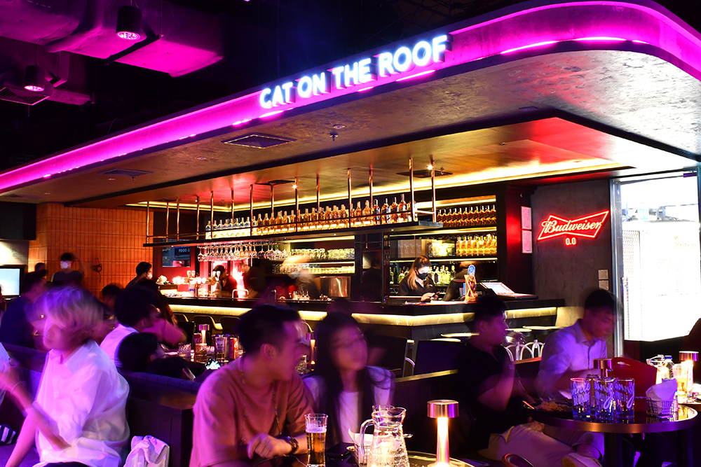 เสียงเพลงจากวงดนตรีสดแว่วเข้าหูเรามาแต่ไกล ตั้งแต่ยังไม่ทันได้เปิดประตูทะลุออกมาจากฝั่งด้านในห้างมาบุญครอง ซึ่งทำเลหัวมุมสกายวอล์กของ Cat on the Roof MBK ถือเป็นทำเลทองของสเปซเปิดใหม่แห่งนี้เลยก็ว่าได้ โดยถ้าใครอยากนั่งชิลล์รับลม (ไม่อยากคิดถึงความฟินช่วงหน้าหนาวเลย!) ก็สามารถนั่งโต๊ะด้านหน้าร้าน ที่มาพร้อมบรรยากาศชีวิตคนเมืองยามค่ำคืนที่ไม่มีวันหลับใหล สามารถเห็นมูฟเมนต์คนเดินผ่านไปผ่านมา และแสงสียามค่ำคืนของย่านสยามสแควร์ได้ชัดถนัดตา