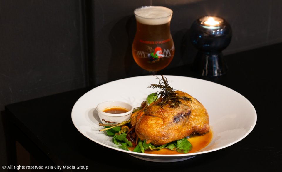 โดยเชฟทั้งสองตั้งใจทวิสต์ทุกเมนูให้มาเหนือความเคยชินของคนปกติ อาทิ เมนู Half Chicken (380 บาท) ที่จับไก่ครึ่งตัวไป souvide จนเนื้อนุ่ม แล้วเอาไปทอดกรอบ ๆ เสิร์ฟพร้อมซอสสโมกกี้เลมอนที่แอบผสมแอปเปิ้ลไซเดอร์ลงไปด้วย เชฟบอกว่าจานนี้จิบคู่กับเบียร์ La Chouffe (260 บาท) จะได้ฟีลลิ่งแบบนั่งเล่นอยู่ในบาร์ที่ยุโรปมาก ๆ แต่ถ้าจะเอาให้ฟูลคอร์สกว่านั้น เราแนะนำให้ดื่มคู่กับ Thaiquiri (350 บาท) ค็อกเทลตัวใหม่ที่เชฟดันแปลงคลาสสิคค็อกเทลอย่าง Daiquiri ด้วยการผสมเสาวรส พริก น้ำส้มสายชู และน้ำตาลลงไป แล้วแต่งขอบแก้วด้วยข้าวคั่ว ตะไคร้ ขิง และข่า