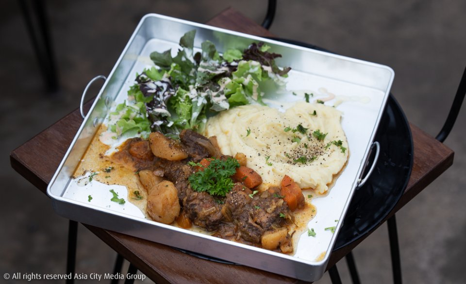 ความนิวยอร์กยังไม่จบแค่สูตรค็อกเทลที่พี่พลอยไปได้มาจากบาร์ที่ฝั่งนิวยอร์ก แต่ยังลามไปถึงเมนูอาหารที่ถูกครีเอทโดยหุ้นส่วนอีกคนของร้านอย่าง คุณเด๋อ-ชลธาร อุบลชลเขตต์ กลายเป็นอาหารกลิ่นอายอเมริกันจ๋า ๆ ไม่ว่าจะเป็น Beef Stew (300 บาท) ที่พี่เด๋อใช้เนื้อติดซี่โครงไปเคี่ยวนานถึง 2 ชั่วโมง จับมาทวิสต์นิดหน่อยด้วยเครื่องเทศไทย เสิร์ฟพร้อมมันบดเนื้อเนียน สั่งมาทานคู่กับออร์เดิร์ฟที่คนรักของทอดต้องเลิฟมากเว่อร์อย่าง Ringlastic (120 บาท) คือฟินสุด เพราะพี่เด๋อใช้หอมหัวใหญ่สองวงมาประกบกัน ยัดไส้ที่ว่างด้านในด้วยชีสเน้น ๆ ก่อนเอาไปทอดกรอบ