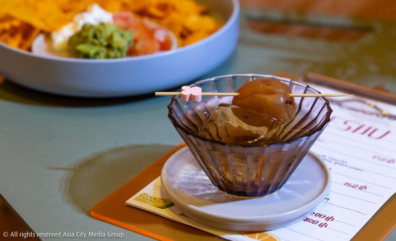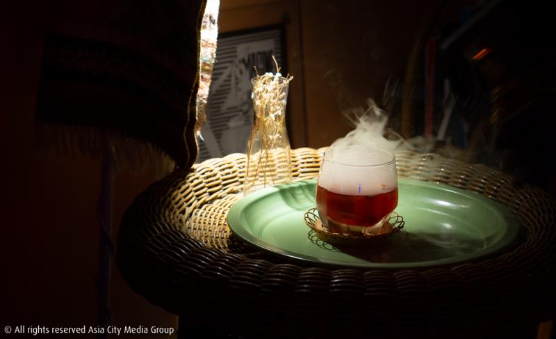 เราเริ่มต้นด้วยแก้วซิกเนเจอร์ที่รีเควสต์ไปว่า 'ขออะไรก็ได้ที่แรงสุดในร้าน' เลยได้มาเป็น Oh! Ume (300 บาท) แก้วนี้ที่เป็นสไตล์ Spirit Forward หรือเหล้าชนเหล้าล้วน ๆ มีเบสเป็นเหล้าพิเศษ 3 ชนิด ตัวแรกคือ Campari ตัวที่สองคือเหล้าไวท์รัมที่นำไป Infused กับชาเม็ดอะโวคาโดของที่ร้าน ส่วนตัวสุดท้ายเป็นเหล้าบ๊วยโฮมเมดดีกรีแรง ที่เลือกใช้บ๊วยออแกนิกจากเชียงรายมาดอง ปิดท้ายด้วยการสโมกควันกลิ่นเปลือกส้มเข้าไปแน่น ๆ เพื่อความเท่