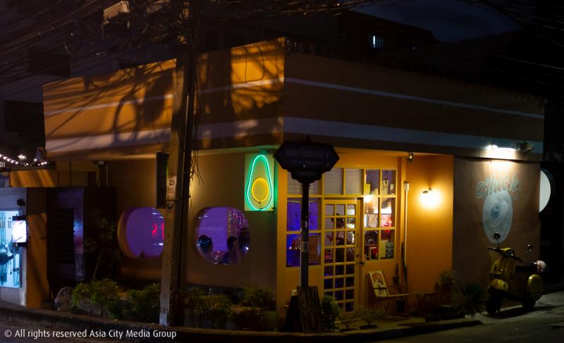 ไฟนีออนรูปอะโวคาโดสีเขียวยังถูกเปิดฉายแสงให้ถนนหัวมุมซอยอารีย์สัมพันธ์ 4 อยู่เหมือนเดิม แต่ที่เพิ่มเติมคือโทนแสงสีในพาร์ตกลางคืนของร้านนี้เขาเปลี่ยนไปเป็นคนละเรื่องกับพาร์ตกลางวันอย่างสิ้นเชิง เริ่มจากการเพิ่มมู้ดแสงนัว ๆ สีน้ำเงินที่สะท้อนกับผนังร้านฝั่งสีเทา และแสงสีแดงสะท้อนกับผนังฝั่งสีส้ม