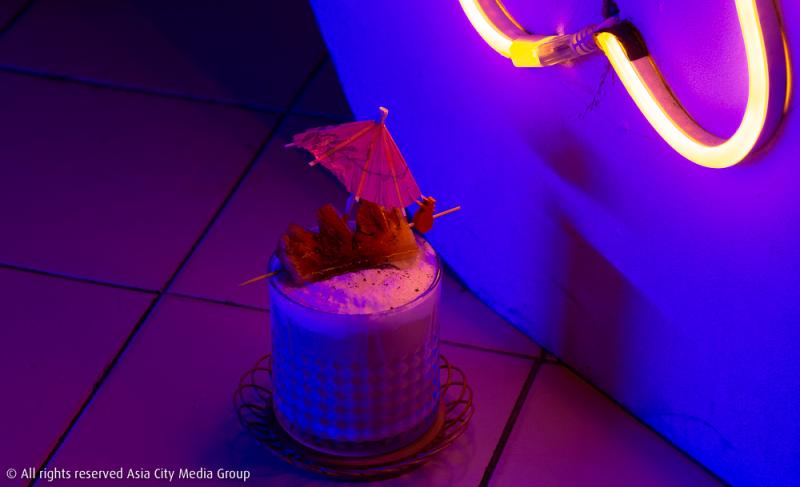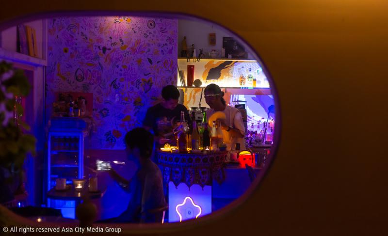 ตัวบาร์ที่จากตอนกลางวันเป็นบาร์โล่ง ๆ คลีน ๆ ดูมุ้งมิ้ง ก็แปลงโฉมจนแทบจะจำไม่ได้ด้วยวิชวลสุดอาร์ตชวนมัวเมา ประกอบกับชั้นวางขวดเหล้าบ๊วยด้านหน้าที่เหมือนเป็นกิมมิกของพาร์ตกลางคืน แถมด้วยการสาดชื่อร้านไปส่องบนเพดานแบบฮิปมากเวอร์