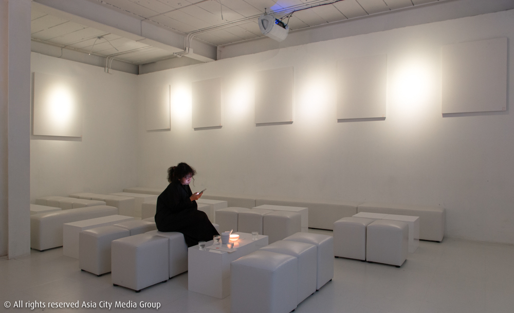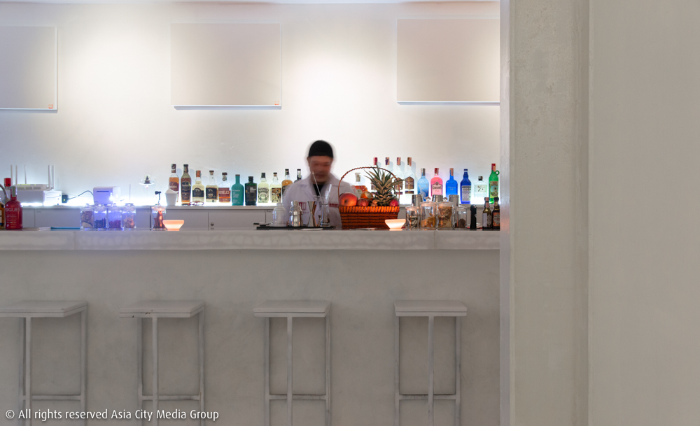 หลังจากสีแดงสีที่หน้าประตู ภายในตัวร้านก็แทบจะไม่มีสีอะไรอื่นอีกเลยนอกจากสีขาว ซึ่งพอเราได้นั่งคุยกับเจ้าของร้านสายอาร์ตติสต์อย่าง พี่ธี-ธีรวัฒน์ มงคลทรัพย์ ก็เลยได้รู้ถึงสาเหตุของการย้อมสีร้านให้ขาวโพลนตั้งแต่ผนัง โต๊ะ เก้าอี้ เคาน์เตอร์บาร์ ยันคอสตูมบาร์เทนเดอร์สีขาวสไตล์นักวิทยาศาสตร์ในแล็บทดลองแบบนี้ ก็เพื่อจะลิงก์กันกับคอนเซปต์ร้านสปีกอีซี่บาร์ผสมอาร์ตแกลเลอรี ที่พี่ธีอยากให้เป็นโปรเจกต์ทดลอง สร้างทางเลือกใหม่ ๆ ให้นักดื่มสายไนต์ไลฟ์ในย่านนี้นี่เอง