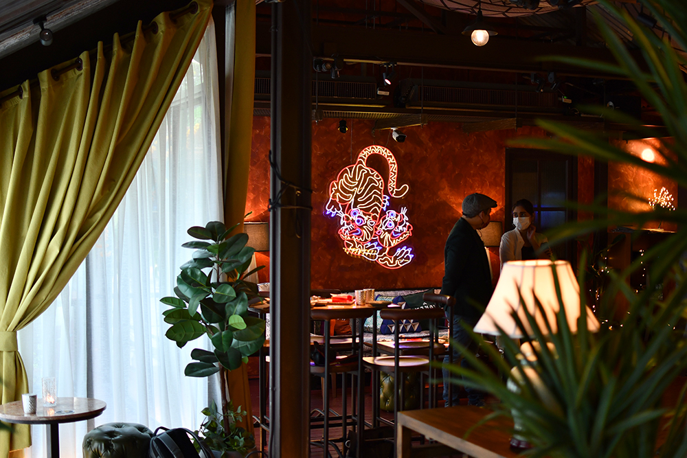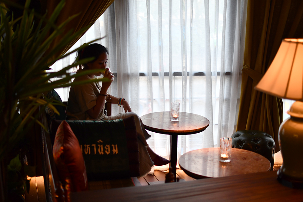 เอาเป็นว่าแค่เห็นชื่อทีมพาร์ตเนอร์หลักของร้านก็แทบจะไม่ต้องสงสัยอะไรอีกแล้วในความจริงจังของบาร์น้องใหม่ (แต่คนทำไม่ใหม่) แห่งนี้ ซึ่งที่เราประทับใจมาก ๆ เป็นอย่างแรกตั้งแต่เปิดประตูเข้าไปบนพื้นที่บาร์ที่ซ่อนอยู่บนชั้น 2 ของร้าน 100 Mahaseth คือการตกแต่งที่ฉีกแนวออกมาจากสปีกอีซี่บาร์ปกติที่พี่หนึ่งและพี่แจนเคยทำ โดยครั้งนี้เลือกมาในธีมไทย-โมเดิร์นที่ทางร้านเรียกสไตล์การตกแต่งนี้ว่า 'Thai-Roccoco' (มาจาก Thai-Rocco-Disco) โดยตั้งใจให้ลิงก์กับร้านอาหารไทย-อีสานของเชฟชาลีที่อยู่ด้านล่าง เราชอบความพร็อพแต่งร้านต่าง ๆ ที่หยิบเอาไอเทมไทยบ้านมาอัปเกรดให้ดูแพงได้แบบมีเทสต์ อาทิ การใช้หมอนลายขิดหรือหมอนหนุนทรงสามเหลี่ยมมาวางบนเก้าอี้ไม้ทรงแคร่ รวมถึงการใช้เสือที่ตีความจากความเชื่อแบบไทย ๆ มาเป็นโลโก้ และหลังคาสังกะสีที่เพิ่มกลิ่นอายแบบโลคอลเข้ามาตัดเลี่ยนให้บาร์แห่งนี้ได้เป็นอย่างดี