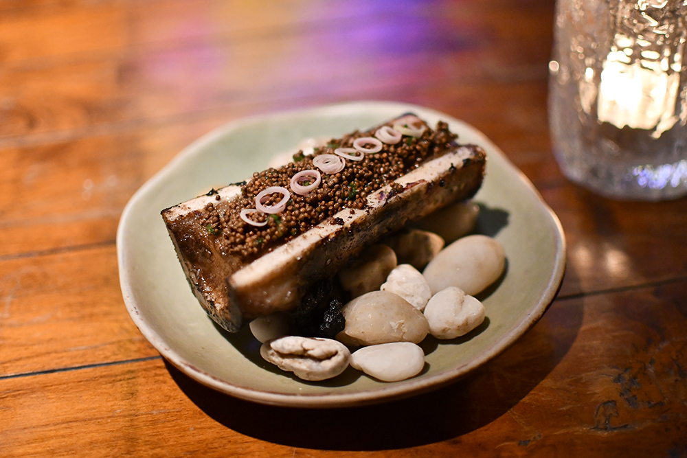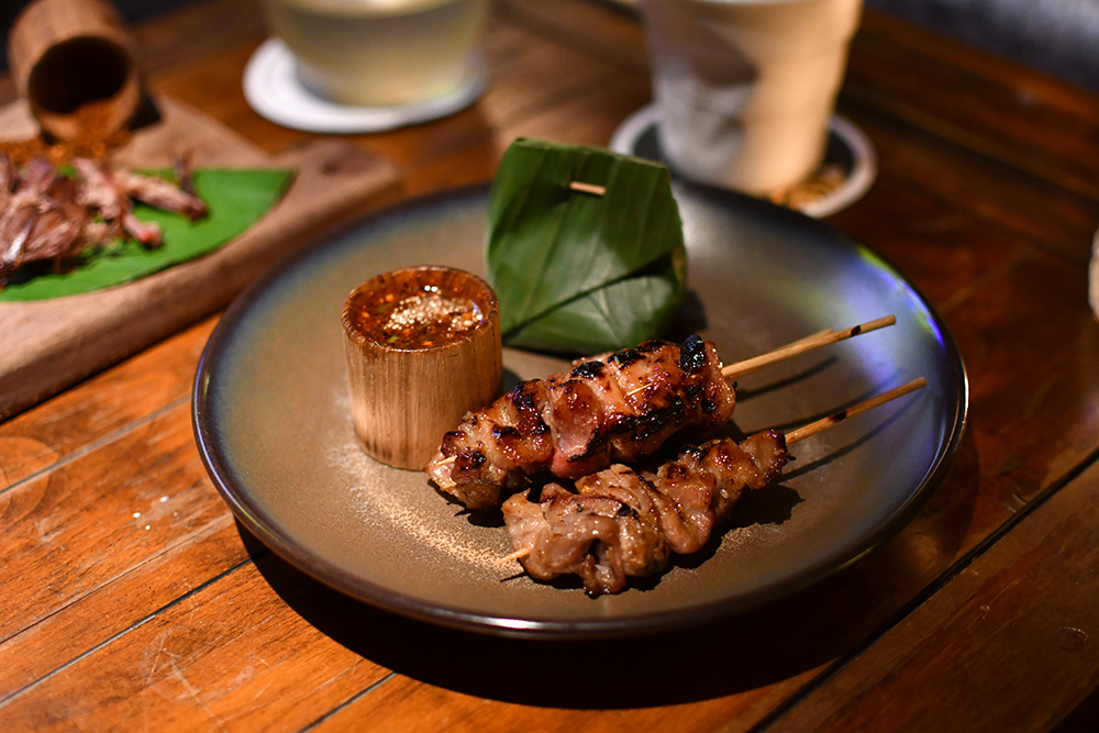 สำหรับใครที่กลัวจิบค็อกเทลเยอะ ๆ แล้วจะมึน ที่นี่เขาก็มีเสิร์ฟจานเด็ดที่ได้อินสไปร์มาจากร้านด้านล่างของเชฟชาลี ซึ่งนำเอาเมนูลูกรักที่แฟนคลับเชฟชาลีหลาย ๆ คนน่าจะคุ้นปากอย่าง ข้าวเหนียวหมูปิ้ง (200 บาท) และ ไขกระดูกงาขี้ม่อน (200 บาท) มาเสิร์ฟด้านบนค็อกเทลบาร์แห่งนี้ในไซซ์เล็กพอดีคำ สำหรับแก้ท้องว่างด้วย