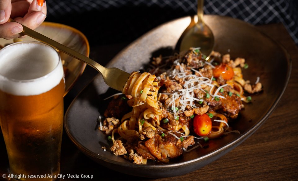 อย่างเช่นในพาร์ทอาหาร ที่ได้ คุณน็อต-ชาฏิ วิโนทัย จากร้าน Sousaku, Nabe Nabe และ Sasori Izakaya มาดูแลเรื่องวัตถุดิบและครีเอทจานเด็ดที่เราขอขีดเส้นใต้ไว้ตรงนี้ว่าควรมาโดน อาทิ Pasta Kak Kak (340 บาท) ที่ไม่ได้กากเหมือนชื่อเลยซักนิด แต่เป็นการเอาเส้นเฟตตูชินี่มาเสิร์ฟคู่กับเนื้อสามชั้นจากอเมริกา ที่ตุ๋นกับซอสไวน์แดงจนชุ่มฉ่ำ โรยด้วยกากเนื้อเจียวเองแบบไม่ยั้ง ใครรู้ตัวว่าเป็นสายเนื้อที่แท้ขอเรียนเชิญ