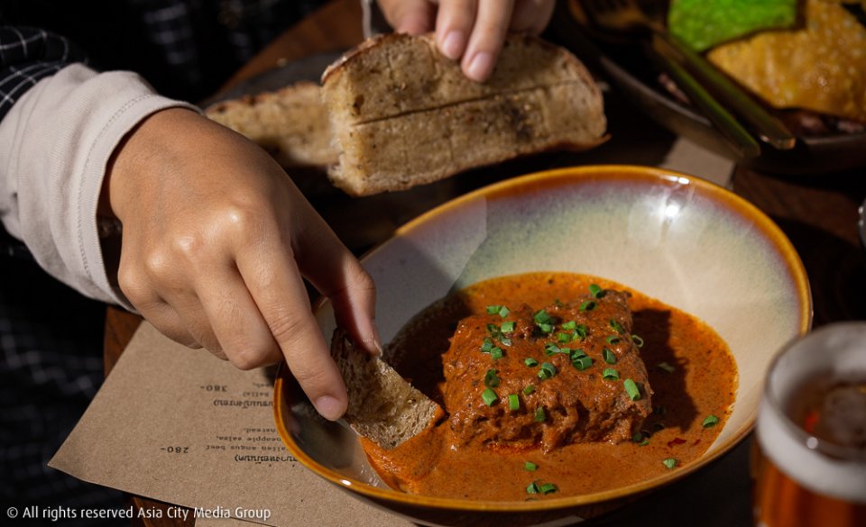 จานที่เราได้ลองคือ Beef Cube With Bread (380 บาท) ใช้เนื้อสับอบเกรดพิเศษจากอเมริกา เสิร์ฟคู่กับซอสสูตรลับที่มีส่วนผสมของถั่วเน่า พริกลาบ ซอสมะเขือเทศเข้มข้น และแถมด้วยขนมปังออสเตรียจาก Landhaus จุด ๆ นี้คือแค่เอาขนมปังไปจิ้มซอสในจานก็ฟินแล้ว