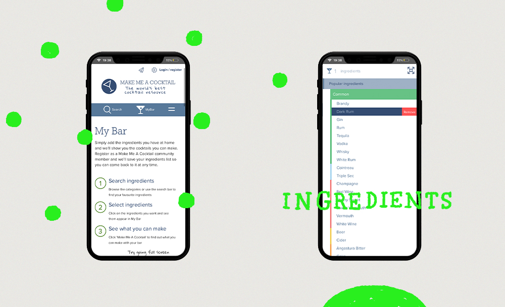 หน้าตาเว็บไซต์คลีน ๆ สะอาดตาของ https://makemeacocktail.com อาจดูไม่แฟนซีมากนัก แต่ก็ถือว่าใช้งานง่ายและไม่ซับซ้อนดีเหมือนกัน สิ่งที่ต้องทำในตอนแรกคือเข้าไปในแท็บ My Bar แล้วจัดการลิสต์วัตถุดิบทั้งหมดที่มีในบ้านลงไป (เน้นว่าต้องใส่ทุกอย่างจริง ๆ นะ จะได้ครีเอตมาได้หลาย ๆ สูตรให้เลือก)