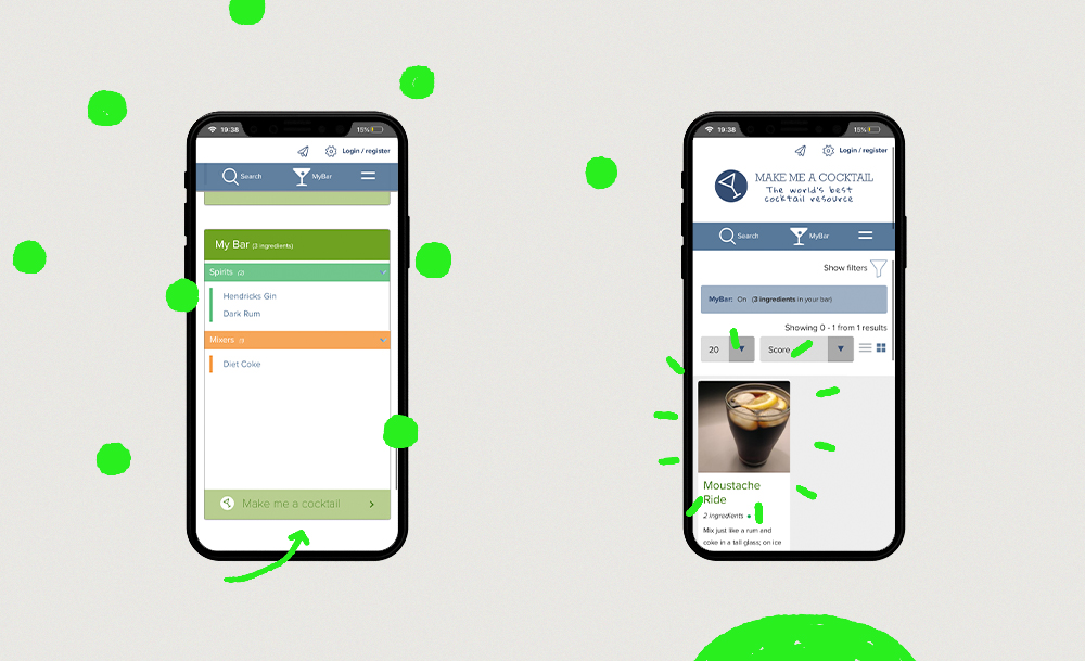 จากนั้นจึงกดปุ่ม Make Me A Cocktail แล้วก็แต่นแต๊นนนนน~ ออกมาเป็นสารพัดสูตรค็อกเทลที่เราสามารถทำได้จากส่วนผสมทั้งหมดในลิสต์ ของเราครีเอตออกมาได้ 48 สูตร ไล่ตั้งแต่แก้วคลาสสิกอย่าง Gin Sour, Daiquiri, Gimlet ไปจนถึงสูตรแปลก ๆ สุดแฟนซีอย่าง Earl Grey Gin Cocktail และ Virgin Strawberry Daiquiri ซึ่งทั้งหมดมาพร้อมปริมาณของส่วนผสมอย่างละเอียด พร้อมบอกขั้นตอนการทำง่าย ๆ ให้เราได้ทำตามเองที่บ้าน ที่น่ารักคือเขาให้เลือกได้ด้วยว่าที่บ้านมีแก้วทรงไหนด้วย อินดีเทลทุกขั้นตอนอย่างแท้ทรู เราลองกดดูเล่น ๆ อีกครั้งแล้วใส่ส่วนผสมไปแค่ 3 อย่าง นางก็สามารถครีเอตเป็นค็อกเทลให้ได้เหมือนกัน อะเมซิ่งมากเวอร์