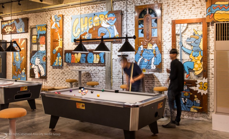 เมื่อก้าวพ้นประตูเข้าไป เราจะได้ยินเสียงเพลงสนุกๆ จังหวะ Upbeat ลอยเข้ามาสู่โสตประสาทเป็นอันดับแรก เมื่อมองไปรอบๆ จะเจอกับผนังเพ้นท์มือเป็นรูปตัวการ์ตูนสีสันสดใสที่แอบกวนประสาทนิดๆ ซ้ายมือสุดมีโต๊ะพูล 2 ตัวครองพื้นที่อยู่