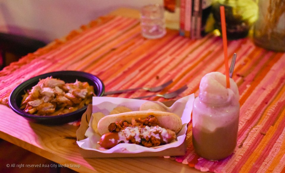 ถึงที่นี่จะลึกลับและเป็นกันเอง แต่อาหารทานเล่นที่นี่นั้นจริงจังกว่าที่คิดนะ อย่าง Poutine อาหารยอดฮิตของชาวแคนาดา เป็นเฟรนช์ฟรายทำเองเสิร์ฟกับไก่กรอบราดซอสเกรวี่กับชีส ทั้งจานนี้ 100 บาทถ้วน กับ Hot Chili Dog (89 บาท) และรูทเบียร์โฟลท (69 บาท)