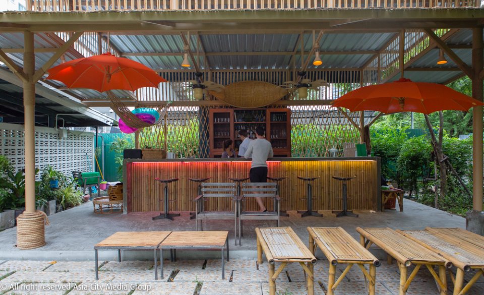 ส่วนถ้าวันไหนอากาศดีเค้าก็จะเอาเสื่อออกมาปูให้นั่งบนสนามหญ้า พร้อมหมอนอิงกับโต๊ะขันโตกสไตล์ล้านนา เรียกว่าเป็นบาร์ที่ผสมผสานเอาดีไซน์ทรอปิคอลชาวเกาะมาคู่กับของใช้แบบไทยๆ ได้สนุกมากๆ อีกทีนึง อารมณ์เหมือนนั่งอยู่บาร์ริมชายหาดเกาะพะงันอย่างงั้นเลย (แค่อันนี้เป็นสนามหญ้าไม่ใช่ทราย)