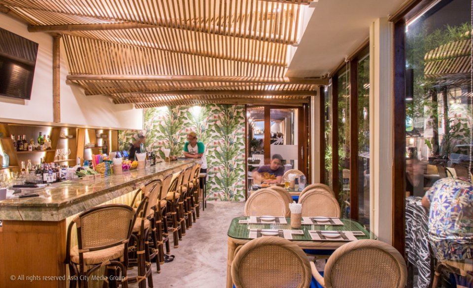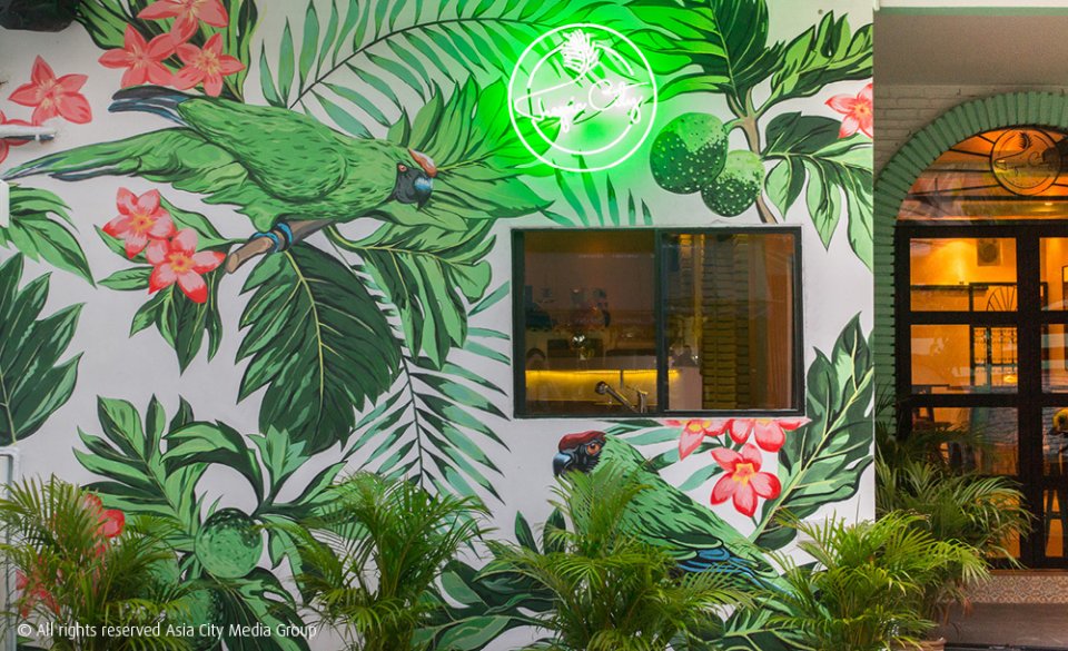 ทุกอย่างของที่นี่ตั้งแต่ผนังอิฐสีขาวเพ้นท์ลายต้นไม้ใบหญ้าสีเขียวทรอปิคอลไปจนถึงเก้าอี้หวาย และโซฟาสไตล์ Mid-Century ยังไม่รวมป้ายไฟนีออนกับกระเบื้องลายชิโน-โปรตุเกสที่ทำให้เหมือนอยู่ภูเก็ตจนแทบแยกไม่ออก เป็นบาร์อะโลฮ่าที่ให้อารมณ์เรโทรนิดๆ ไม่ยัดเยียดตวามฮูลาฮูล่าจนเกินเหตุ