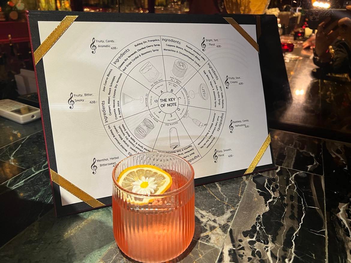 ถัดมาติด ๆ เป็นแก้วที่ตีความจากบทเพลงดังใน Key B (420 บาท) ที่เลือกเล่นกับที่มาของเพลง Piano Concerto ซึ่งมีนักประพันธ์เป็นชาวรัสเซีย ดริงก์แก้วนี้เลยมีเบสเป็น Russian Standard Vodka ที่ไปได้ดีมาก ๆ กับเชอร์รีเชื่อมและเก๊กฮวย ส่วนอีกแก้วที่ตีโจทย์ The Key of Note ได้แตกมาก ๆ ขอยกให้กับ Key C (420 บาท) แก้วที่ทำให้บทเพลงออร์เรสตราบันลือโลกอย่าง Symphony No.5 ของบีโทเฟนมีรสชาติขึ้นมาจริง ๆ โดยเลือกตีความออกมาเป็นรสชาติฟรุตตี้เปรี้ยวหวานจากองุ่นเคียวโฮ เพิ่มความครีมมี่ด้วยไข่ขาวและสเปรย์โยเกิร์ต พร้อมแต่งลายด้านบนแก้วด้วยรหัสมอร์สที่แปลว่าชัยชนะอีกด้วย