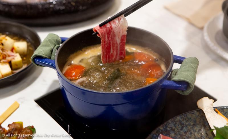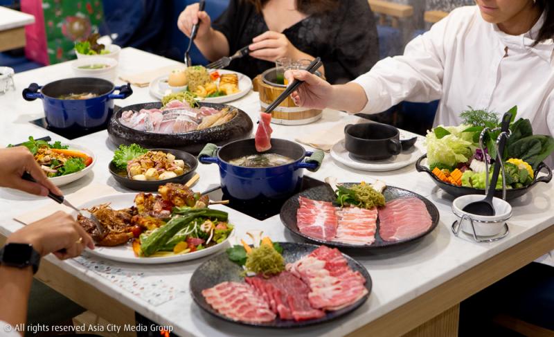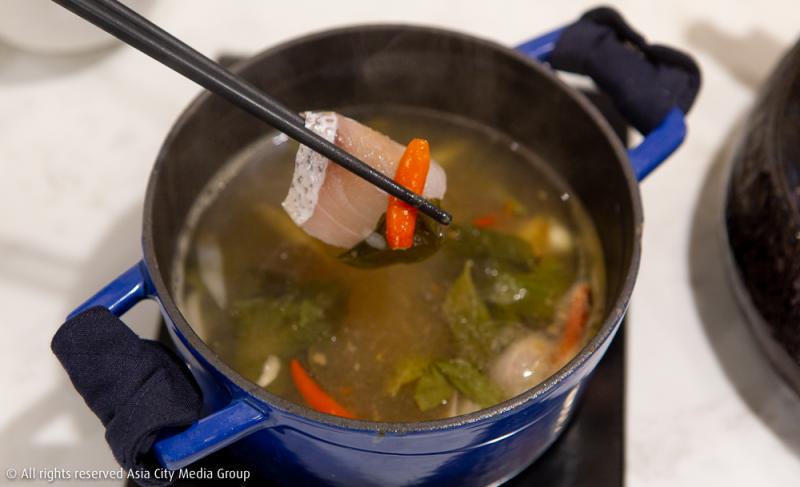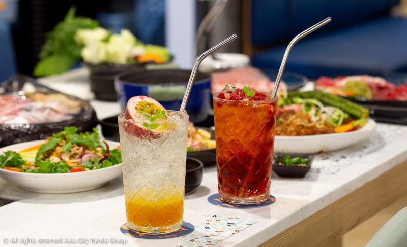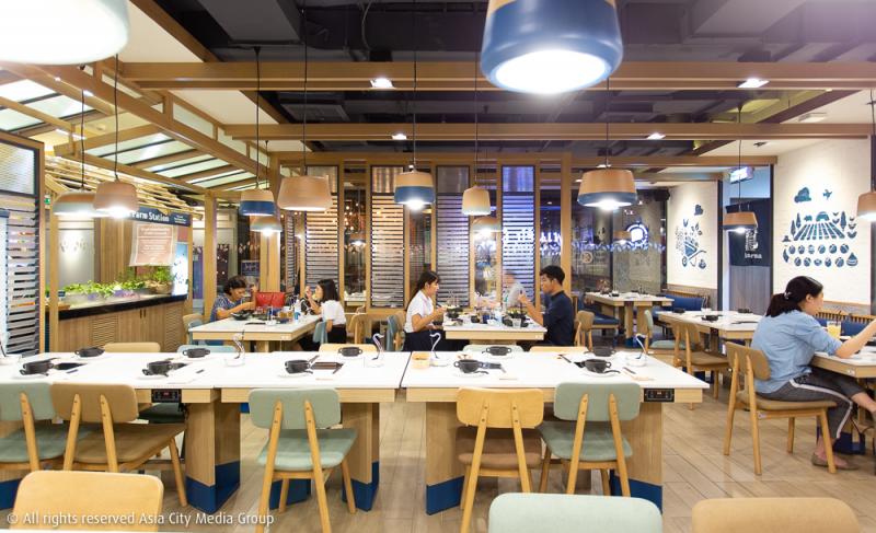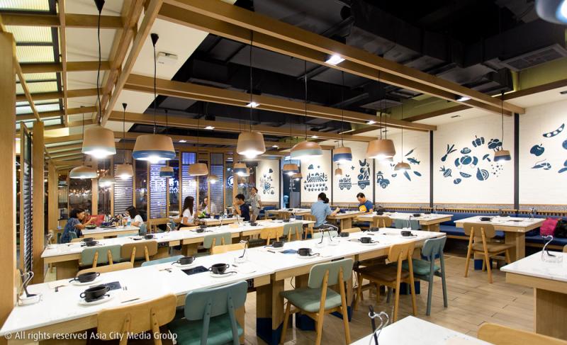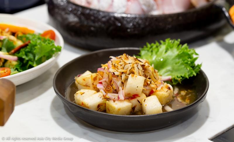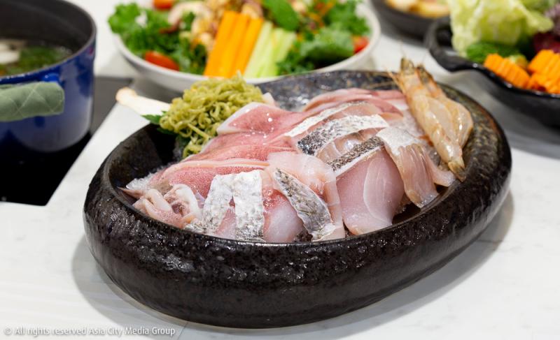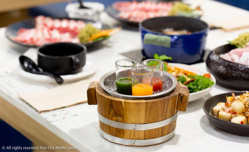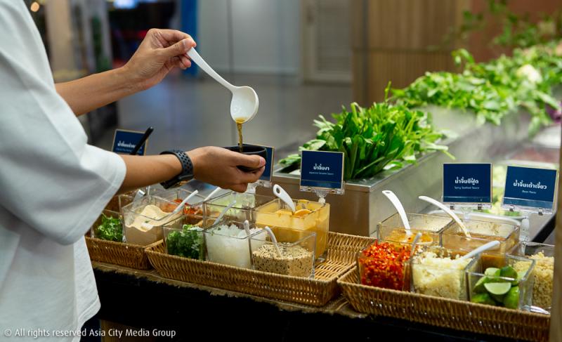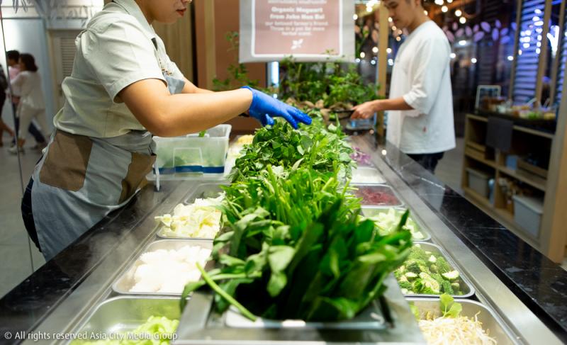 สำหรับใครที่สั่งหม้อต้ม ก็สามารถไปหยิบจับผักสดเอามาลงหม้อได้ไม่อันที่ Farm Station อีกด้วยนะ ซึ่งตรงนี้ก็มีผักให้เลือกเยอะมาก ทั้งผักยืนพื้นว่าเอามาใส่หม้อต้อมต้องอร่อยแน่ ๆ ผักพื้นบ้านที่หากินไม่ได้ง่าย ๆ ไปจนถึงผักตามฤดูกาลที่น่าสนใจ ซึ่งผักเหล่านี้ได้มาจากพี่ตุ้ย จอนนอนไร่ ที่เลี้ยงผักทั้งหมดแบบไม่เคยโดนสารเคมีเลย อย่างวันที่เราไปนั้นก็มีจิงจูฉ่ายออร์แกนิกมาตั้งแบบทั้งต้น ให้เราได้เด็ดใบสด ๆ ไปกินเลยด้วย นอกจากนี้ยังมีโซนน้ำจิ้มให้เติมแบบแน่นจริง เพราะมีน้ำจิ้มให้เลือกถึง 5 แบบ ตั้งแต่น้ำจิ้มแจ่วฌานาสำหรับคนชอบอะไรแซ่บ ๆ ไทย ๆ น้ำจิ้มพอนซึและน้ำจิ้มงาสำหรับคนชอบสไตล์ญี่ปุ่น หรือจะเป็นน้ำจิ้มเต้าเจี้ยว และน้ำจิ้มซีฟู้ดสำหรับคนสั่งพวกอาหารทะเลมากินก็ดีงามไม่แพ้กัน
