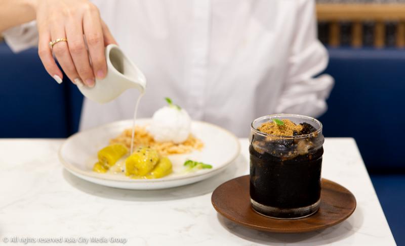 ปิดท้ายด้วยของหวานชื่นใจอย่างกล้วยไข่ไอศกรีม (145 บาท) กล้วยไข่เชื่อมไม่หวานมาก เสิร์ฟกับไอศกรีมมะพร้าวแบบเจลาโต้ ที่รองด้วยข้าวพองกรุบกรอบ กับเฉาก๊วยน้ำตาลทรายแดง (55 บาท) เมนูง่าย ๆ แต่ก็ชื่นใจดีทีเดียว