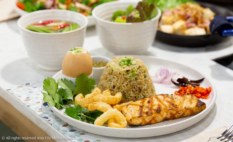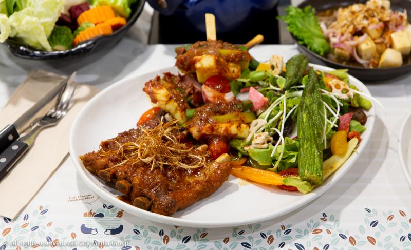 นอกจากพวกหม้อต้มแล้ว ที่นี่ยังมีเมนูจานเดี่ยวให้เราได้สั่งอีกเยอะแยะเต็มไปหมด เราลองสั่งเมนูย่างอย่าง ซี่โครงหมูอารมณ์ดีย่างสมุนไพรตะไคร้กรอบ (395 บาท) ที่มาจากฟาร์มคุณชายละเอียดเช่นเดิม ซี่โครงหมูย่างมาแบบแร็กใหญ่ ๆ แบ่งกันกินได้สองสามคน เสิร์ฟพร้อมผักสดกองโต และผักกรอบ Freeze Dry เพิ่มมิติของอาหาร และผักย่างแบบบาร์บีคิว จานนี้ยกความดีงามให้ซี่โครงที่นุ่มจริงและเนื้อร่อนออกมาจากกระดูกง่ายดี อีกจานเป็นของกินเล่นแต่ก็จริงจังอย่าง ยำสาลี่กะปิชาวดอย (135 บาท) สาลี่กรอบ ๆ หั่นเต๋า นำมายำแบบใส่กะปิหอม ๆ หั่นพริก หอมแดง ถั่วลิสงคั่ว รสไม่จัดมาก ก็ดินเพลิน ๆ แป๊บเดียวหมดเช่นกัน ส่วนจานข้าวเราลองสั่ง ข้าวหอมมะลิอินทรีย์ผัดน้ำพริกหนุ่ม สเต๊กปลาแซลมอน (295 บาท) มาลองชิม จานนี้เราขอมอบมงให้ไข่อนเซ็น ที่เรียกว่าเป็นไข่ขบถ เพราะฟาร์มที่เลี้ยงไก่ไข่นั้นเลี้ยงไม่เหมือนที่อื่น ได่มีพื้นที่กว้าง แถมยังกินน้ำรางจืด ซึ่งเป็นน้ำสมุนไพรอีกด้วยนะ