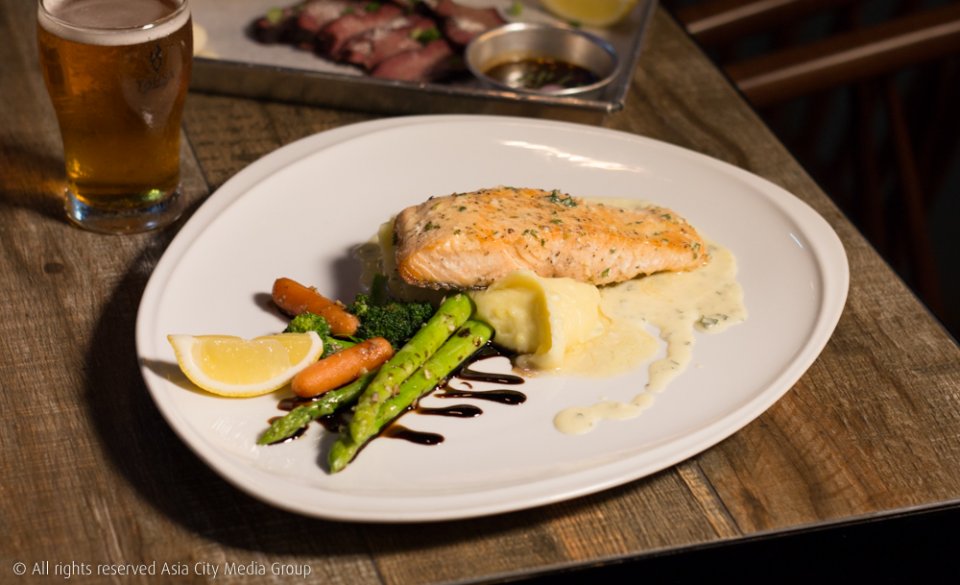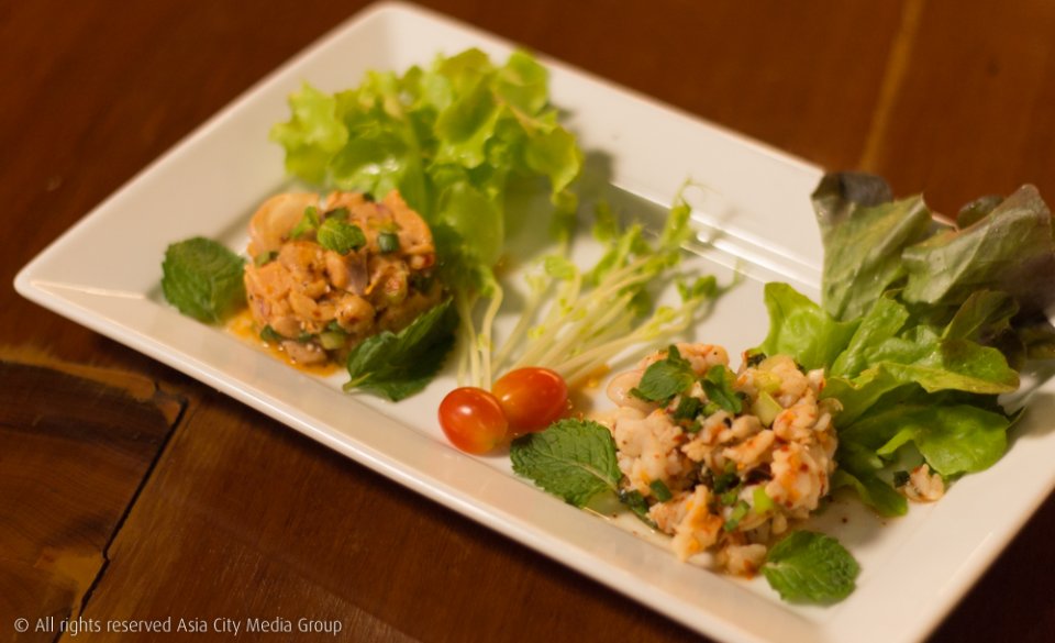 สำหรับใครที่ไม่กินเนื้อ ที่นี่ก็ยังมีเมนูอื่น ๆ มาให้เลือกเช่นกัน อย่าง Pan Fried Salmon (450 บาท) ที่ใช้แซลมอนนอร์เวย์ชิ้นโตมาจี่กับกระทะร้อน ๆ ราดด้วยซอสบัตเตอร์เลมอน และมันบดทรัฟเฟิล หรืออาหารฟิวชั่นเมนูยอดฮิตจากร้านในอดีตอย่าง ลาบสองทวีป (180 บาท) ที่เป็นลาบกุ้งและลาบแซลมอนในจานเดียวกัน ก็มีรสชาติกำลังเข้าที่เข้าทางเลย