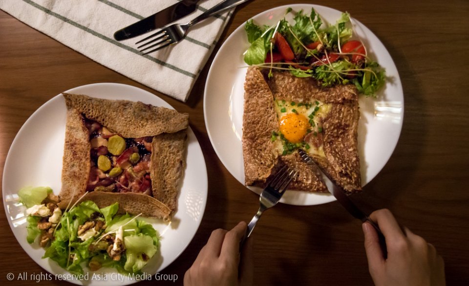และอีกเมนูที่เราชอบมากอย่าง Feeling Blue (200 บาท) ประกอบด้วยวัตถุดิบหลักอย่างเป็ด บลูชีส วอลนัท และลูกเกด ไล่เลยไปจนถึงเมนูแนะนำอย่าง Parisienne (200 บาท) เครปนุ่มสไตล์ฝรั่งเศสที่แมทช์คู่กับไวน์ได้อย่างเพอร์เฟ็ค