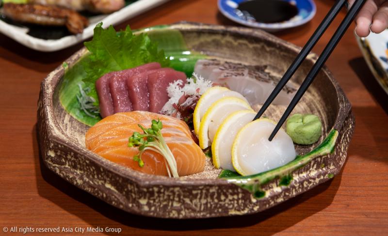 ส่วนตัวอาหารแต่ละอย่างก็รับประกันความสด ทางร้านเคลมว่าวัตถุดิบของเขาค่อนข้างพรีเมียม เราเลยต้องลองขอสั่งมาพิสูจน์เสียหน่อย เริ่มที่ซาชิมิ (3 อย่าง 480 บาท และ 5 อย่าง 680 บาท) ที่จัดทั้งแซลมอน มากุโระ ปลาไท และโฮตาเตะ (หอยเชลล์) แบบหนา ๆ ใหญ่ ๆ จุก ๆ มาให้ในจาน ซึ่งก็สดและเนื้อแน่นอย่างที่เขาเคลม ทางร้านบอกว่าเพราะปลาทั้งหมดเขานำเข้าแบบสด ไม่ใช่แบบแช่แข็ง และนำเข้ามาทั้งตัว แล่ด้วยตัวเอง จึงสดเหมือนกินอยู่ที่ญี่ปุ่นจริง ๆ