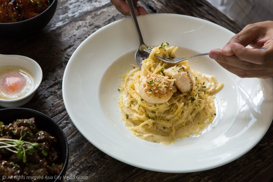 เมนูทั่วไปนอกจากเมนูเนื้อก็เด็ดไม่แพ้กัน เรายกให้ Truffle Scallop Pasta (320 บาท) เป็นพระเอกของเมนูกลุ่มนี้ กลิ่นทรัฟเฟิลหอม ๆ กับหอยเชลล์ตัวใหญ่แบบแทบเท่าฝ่ามือที่นำเข้ามาจากฮกไกโด กินแล้วฟินทะลุเพดานไปเลย ส่วนเมนูอื่น ๆ อย่าง I'Aglio Salmon Pasta (280 บาท) Trio (140 บาท) เมนูเรียกน้ำย่อยที่ผสมระหว่างมะม่วง อโวคาโด และซัลซามะเขือเทศเข้าไว้ด้วยกัน หรือจะเป็นแซลมอนแซบ (180 บาท) ก็เป็นจานมาตรฐานที่ถูกปากคนไทยตลอด