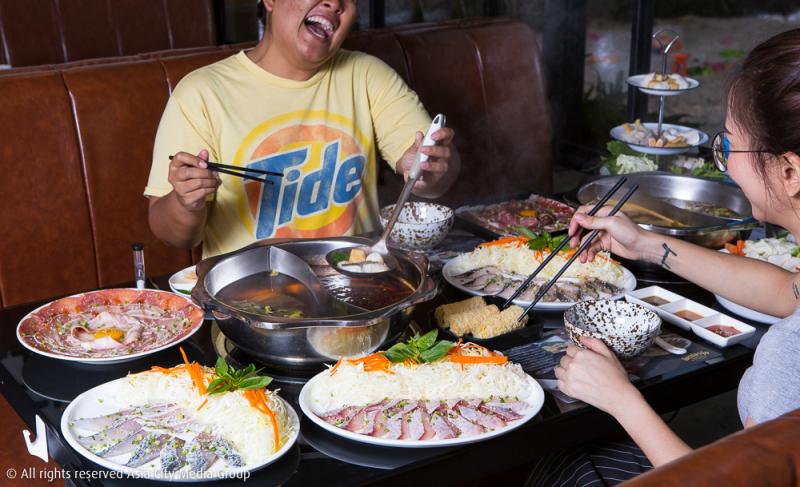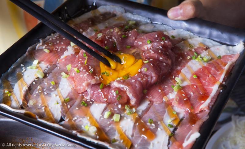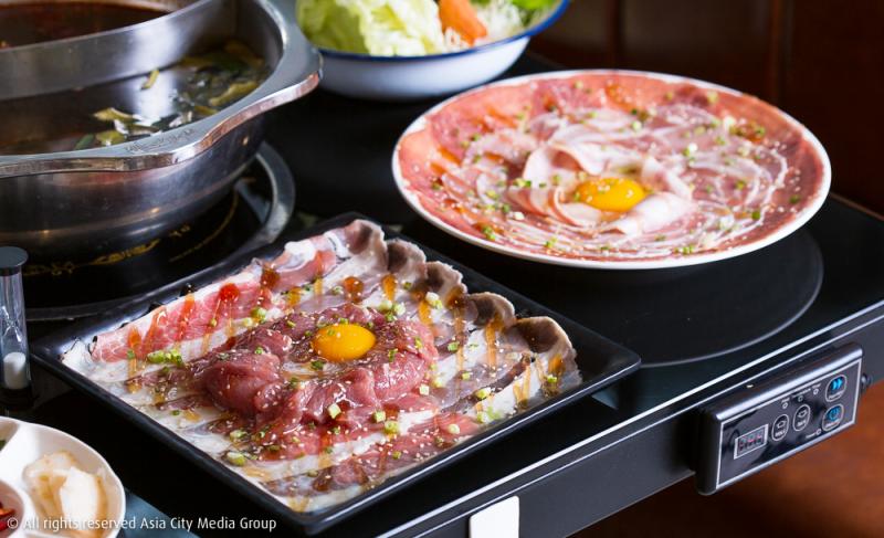 แต่สายไม่ถนัดปลา หรือกลัวว่าบนโต๊ะจะมีแต่ปลาอย่างเดียวแล้วเบื่อเกินไป ทางร้านก็มีเมนูเนื้อและเมนูหมูให้เลือกสั่งด้วย เราลองสั่งชุดหมูและผองเพื่อนตอกไข่ (220 บาท) ที่ในจานจะประกอบไปด้วยสันคอ สามชั้น และสันนอก กับชุดเนื้อและผองเพื่อนตอกไข่ (250 บาท) ที่ประกอบไปด้วยเนื้อส่วนท้อง และเสือร้องไห้ ก็เรียกว่ามาแบบเน้น ๆ ชิ้นใหญ้ไม่หวง ราดซอสสูตรเฉพาะของทางร้านมาพร้อมให้คลุกเนื้อ ซอส และไข่พร้อมกันก่อนลงหม้อด้วย