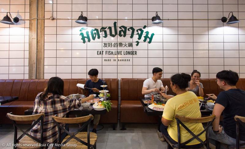 ร้านตั้งอยู่ในโครงการน่ารัก ๆ อย่างดาดฟ้า ที่ตัวเจ้าของร้านเองบอกกับเราว่ารู้สึกชอบรูปแบบของโครงการนี้ที่เปิดโล่ง มีลมโกรก ตัวร้านมีขนาดกำลังดี มีโต๊ะรองรับ 12 โต๊ะ รับลูกค้าได้ 40-50 คนต่อครั้งเลย สิ่งหนึ่งที่เรารู้สึกเข้าไปแล้วเหมือนแวะมาบ้านผู้ใหญ่สักคน ก็เพราะสไตล์การตกแต่งของที่นี่นั่นแหละ คุณอ๋องเป็นผู้ลงมือตกแต่งร้านด้วยตัวเอง เขาบอกกับเราว่าคอนเซ็ปต์ของร้านก็มาจากบ้านคุณตามิตรนั่นแหละ อยากให้ผู้เข้ามานั่งกินปลาจุ่ม เหมือนกำลังมากินที่บ้านของคุณตา เลยหยิบจับเอาส่วนประกอบต่าง ๆ ในบ้านมาตกแต่ง ทั้งอิฐช่องลม กระเบื้องสีขาว และเฟอร์นิเจอร์ที่ให้ความรู้สึกย้อนยุคหน่อย ๆ อย่างโซฟาสีน้ำตาล และโต๊ะสีดำ ที่นำเข้ามาจากจีน และเลือกโทนสีให้เข้ากับบรรยากาศของร้านด้วย